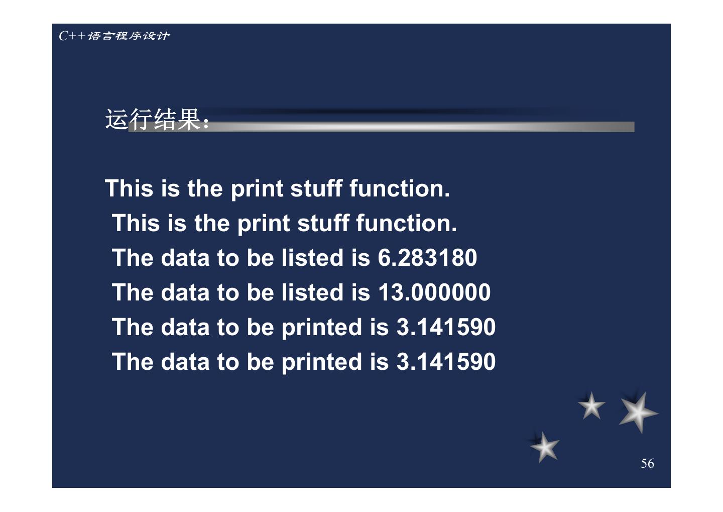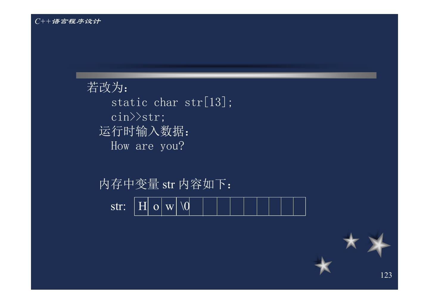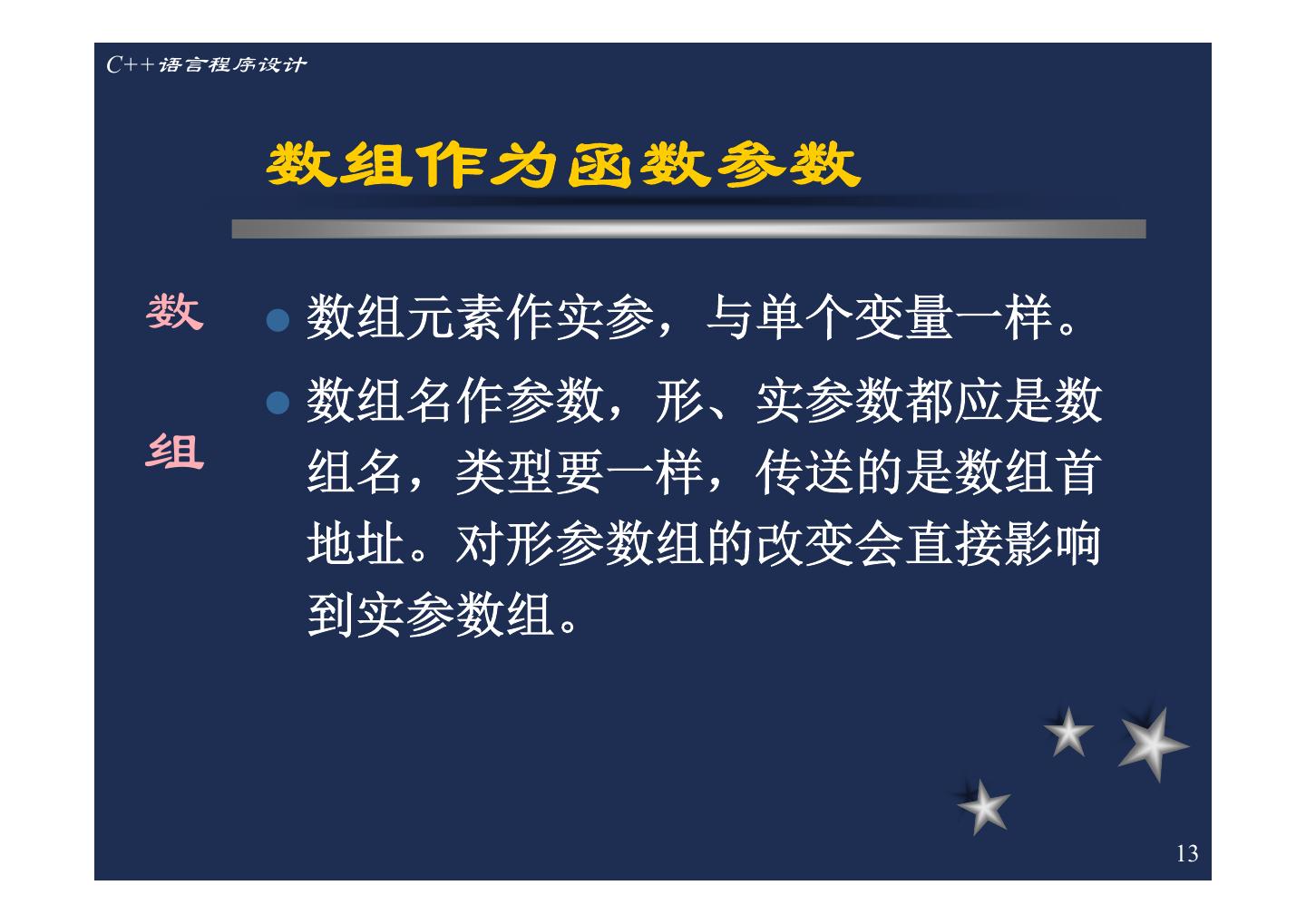 13 .C++语言程序设计 数 数组作为函数参数 数组元素作实参,与单个变量一样。 组 数组名作参数,形、实参数都应是数 组名,类型要一样,传送的是数组首 地址。对形参数组的改变会直接影响 到实参数组。 13