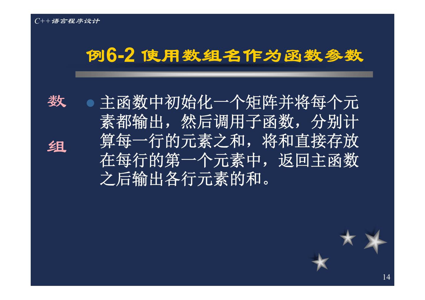 14 .C++语言程序设计 数 例6-2 使用数组名作为函数参数 主函数中初始化一个矩阵并将每个元 素都输出,然后调用子函数,分别计 组 算每一行的元素之和,将和直接存放 在每行的第一个元素中,返回主函数 之后输出各行元素的和。 14