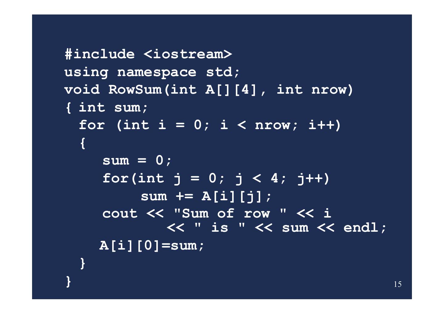 15 .#include <iostream> using namespace std; void RowSum(int A[][4], int nrow) { int sum; for (int i = 0; i < nrow; i++) { sum = 0; for(int j = 0; j < 4; j++) sum += A[i][j]; cout << "Sum of row " << i << " is " << sum << endl; A[i][0]=sum; } } 15