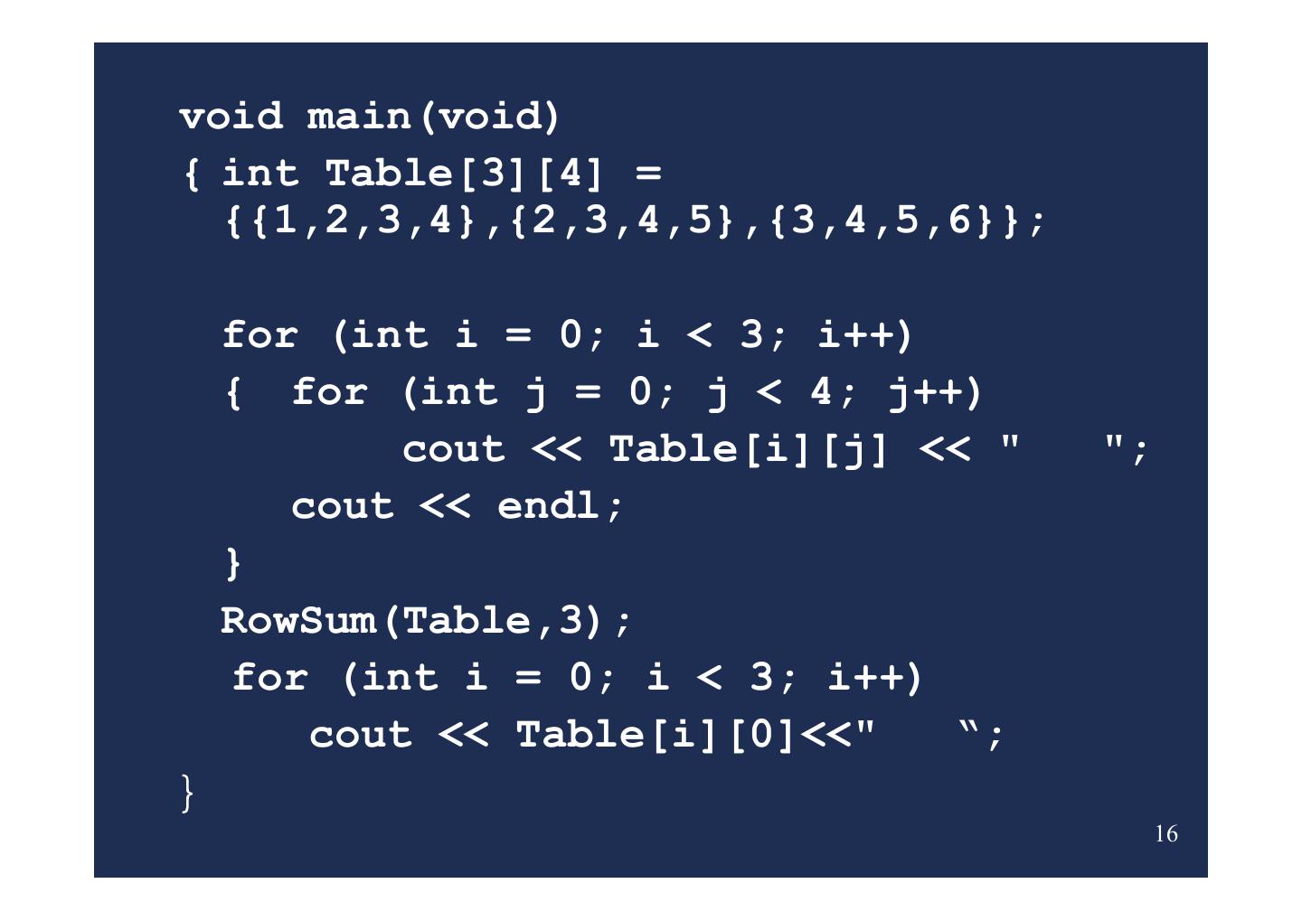 16 .void main(void) { int Table[3][4] = {{1,2,3,4},{2,3,4,5},{3,4,5,6}}; for (int i = 0; i < 3; i++) { for (int j = 0; j < 4; j++) cout << Table[i][j] << " "; cout << endl; } RowSum(Table,3); for (int i = 0; i < 3; i++) cout << Table[i][0]<<" “; } 16