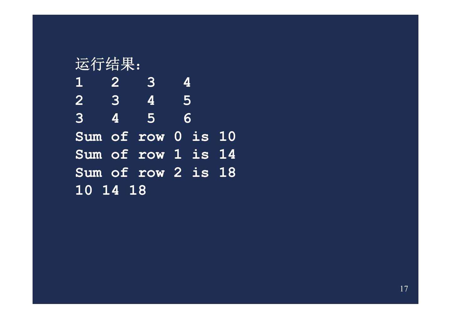17 .运行结果: 1 2 3 4 2 3 4 5 3 4 5 6 Sum of row 0 is 10 Sum of row 1 is 14 Sum of row 2 is 18 10 14 18 17