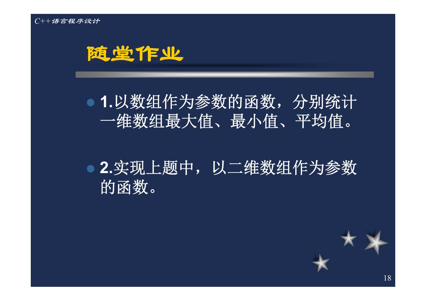 18 .C++语言程序设计 随堂作业 1.以数组作为参数的函数,分别统计 一维数组最大值、最小值、平均值。 2.实现上题中,以二维数组作为参数 的函数。 18