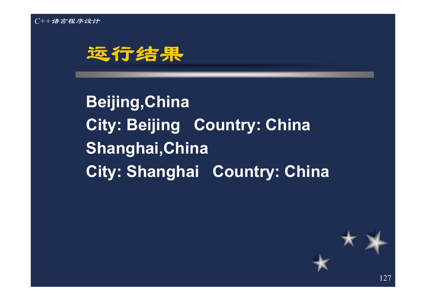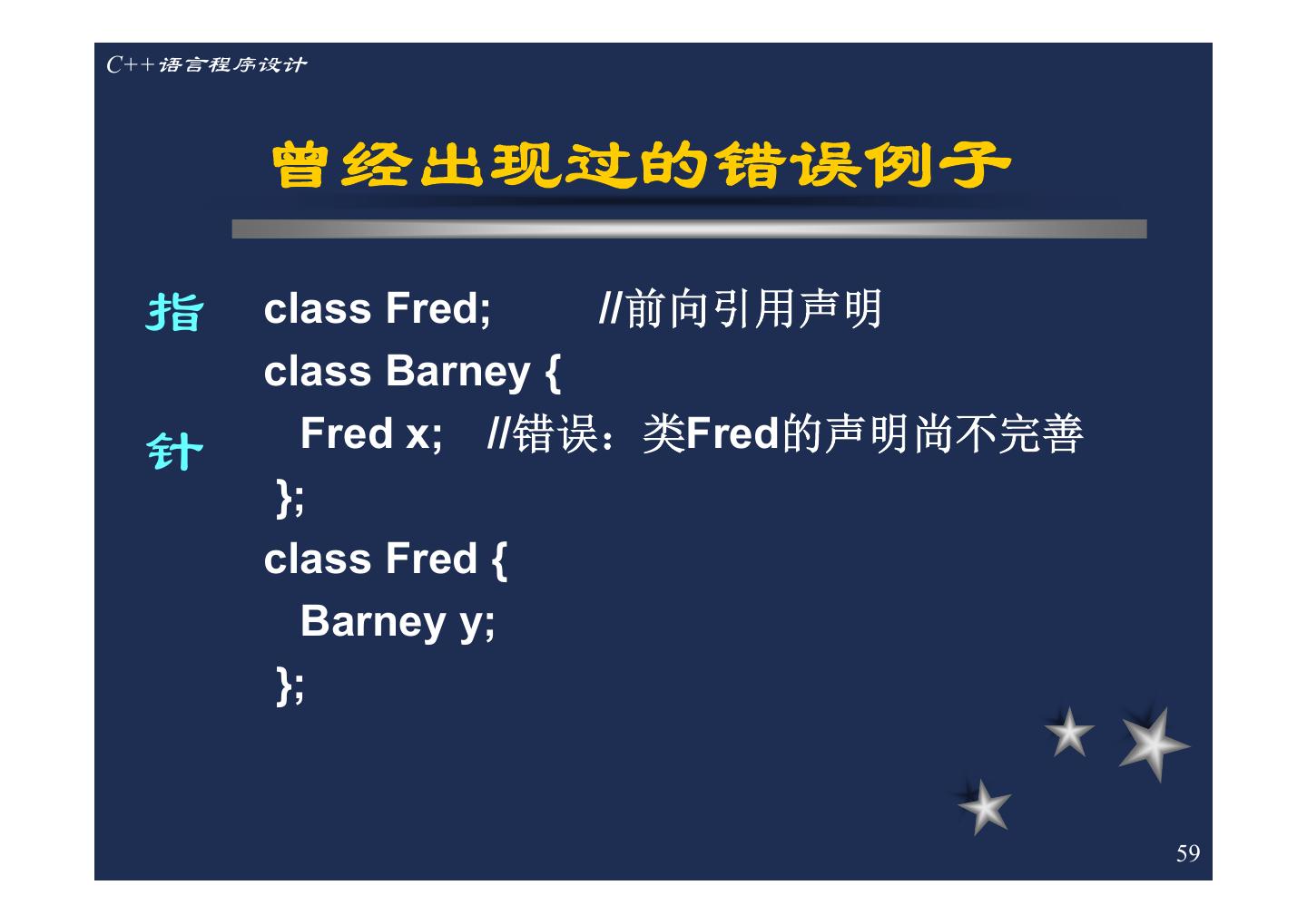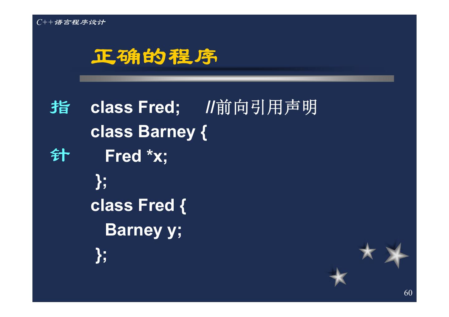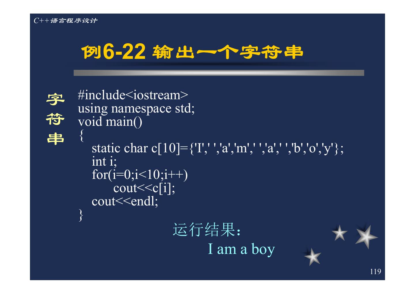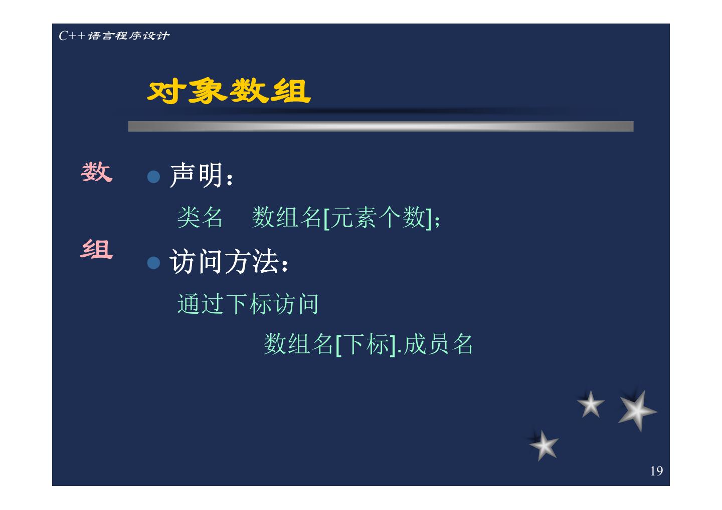 19 .C++语言程序设计 数 对象数组 声明: 组 类名 数组名[元素个数]; 访问方法: 通过下标访问 数组名[下标].成员名 19