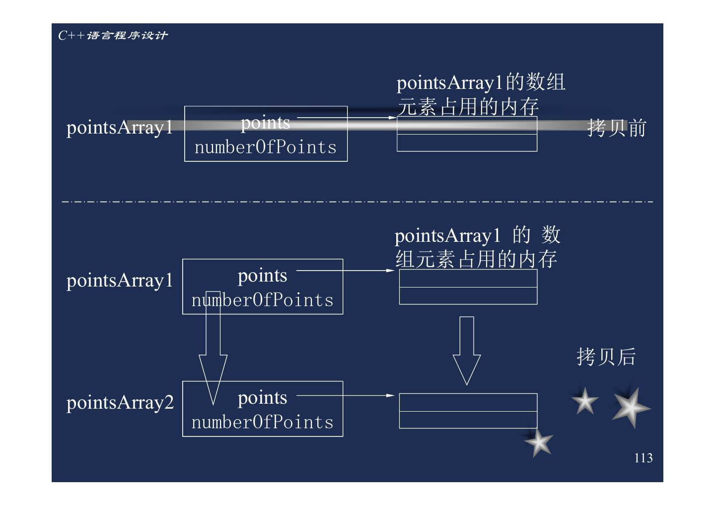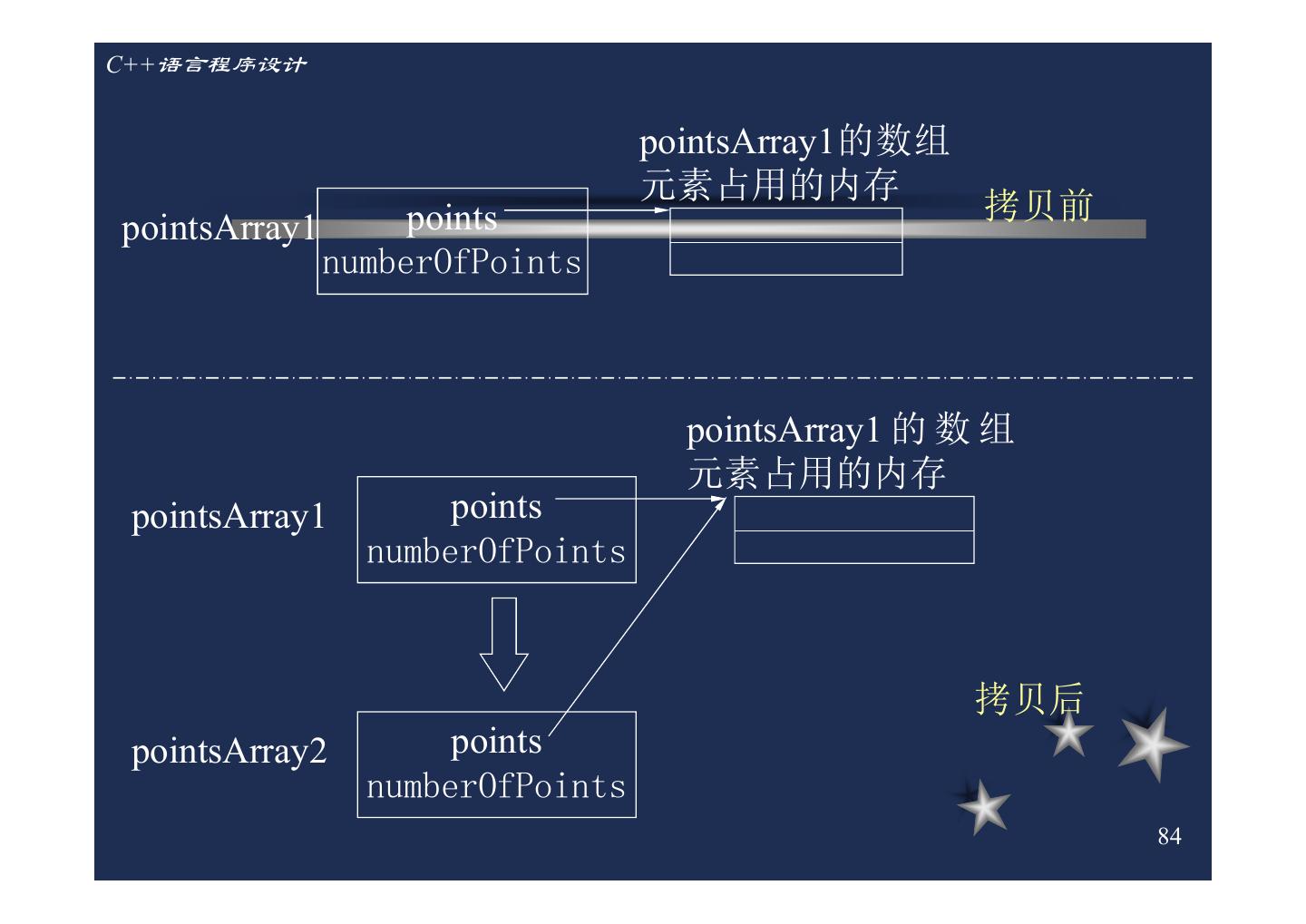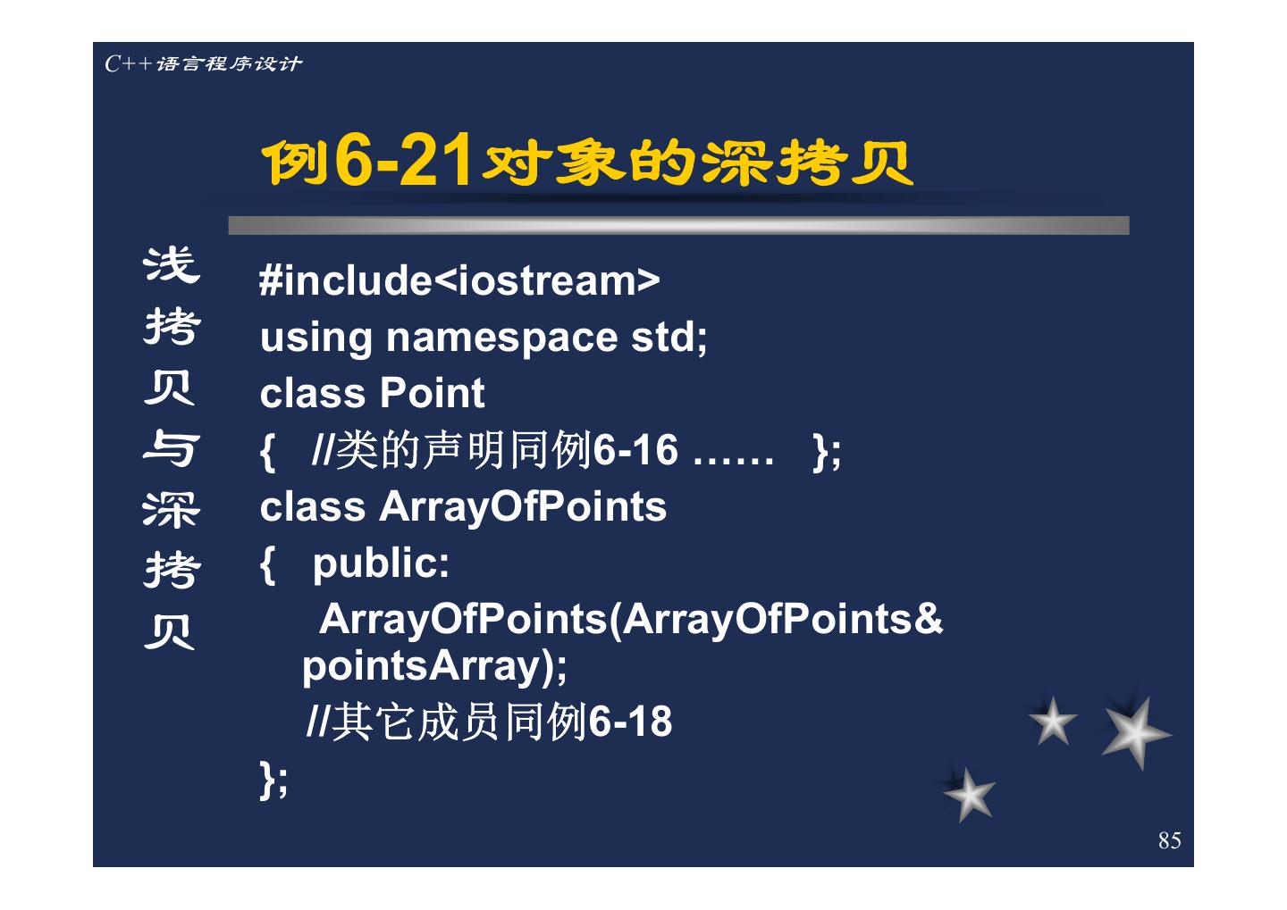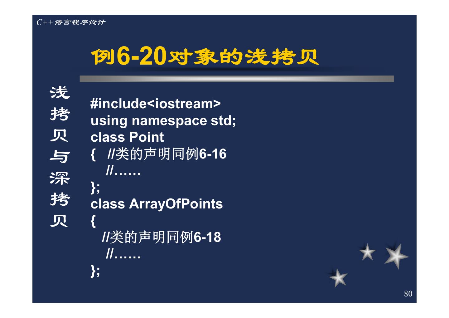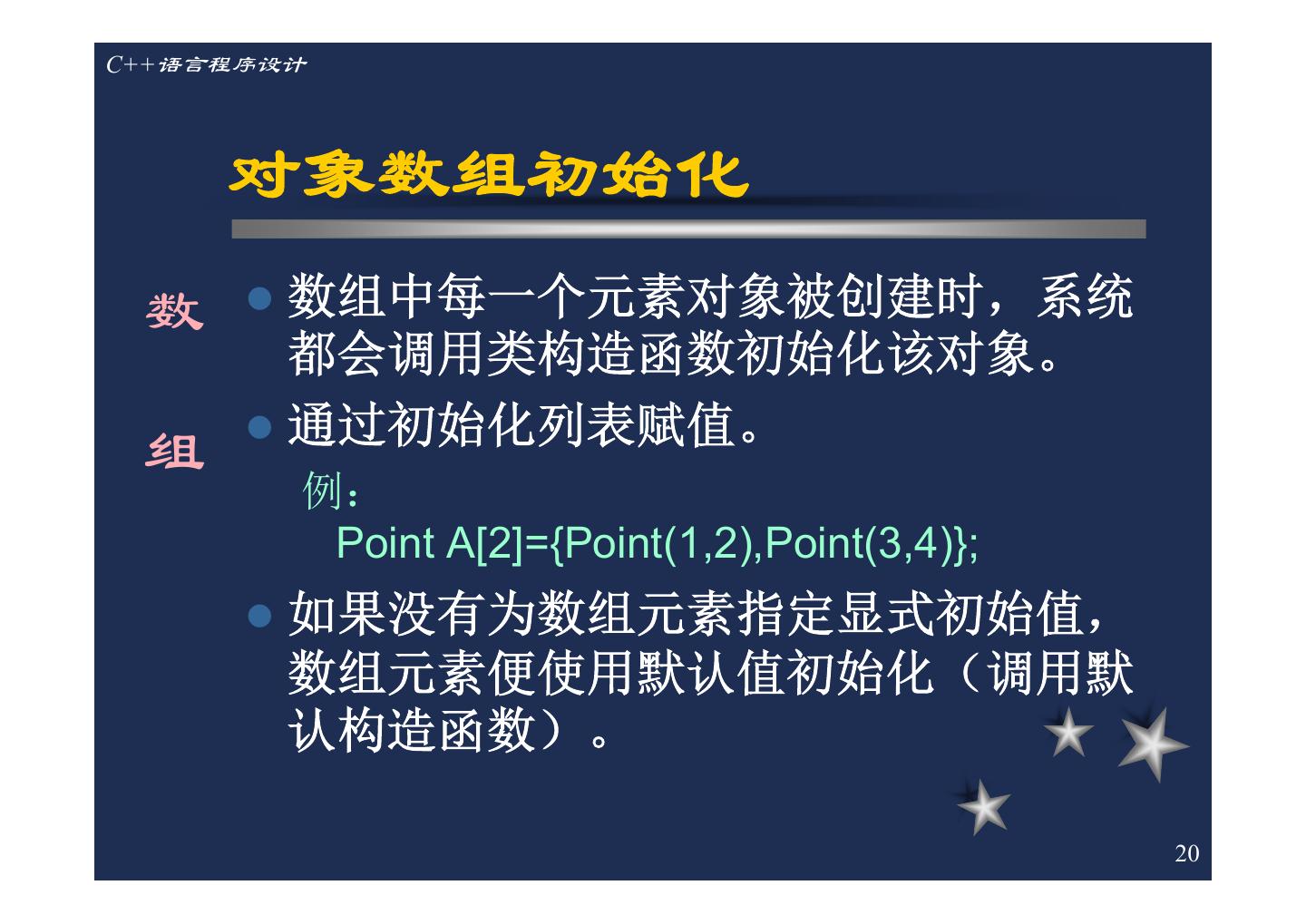 20 .C++语言程序设计 数 对象数组初始化 数组中每一个元素对象被创建时,系统 都会调用类构造函数初始化该对象。 组 通过初始化列表赋值。 例: Point A[2]={Point(1,2),Point(3,4)}; 如果没有为数组元素指定显式初始值, 数组元素便使用默认值初始化(调用默 认构造函数)。 20