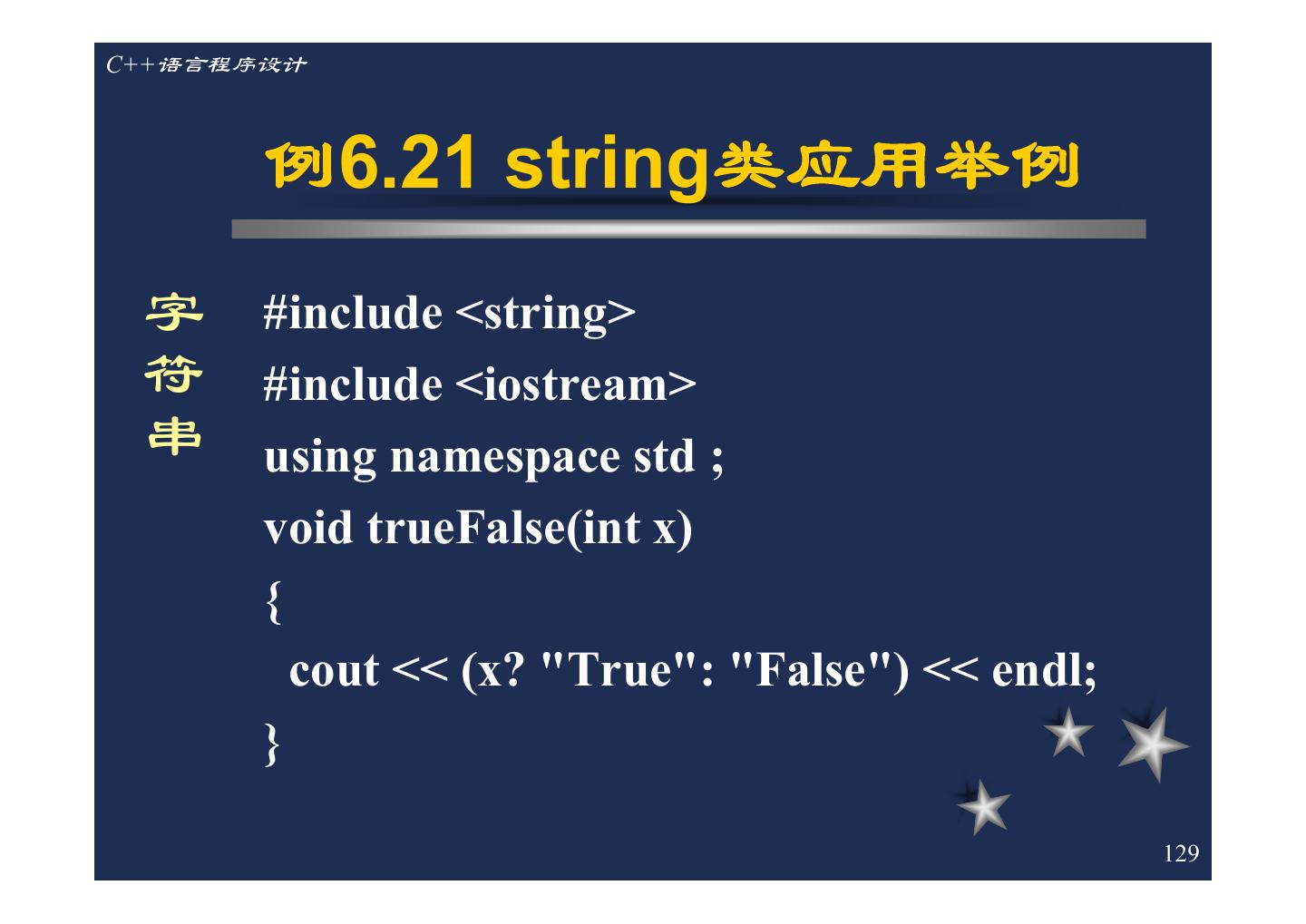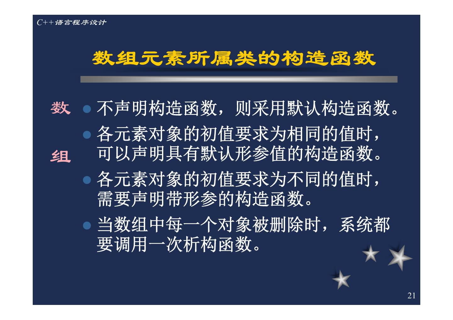 21 .C++语言程序设计 数 数组元素所属类的构造函数 不声明构造函数,则采用默认构造函数。 组 各元素对象的初值要求为相同的值时, 可以声明具有默认形参值的构造函数。 各元素对象的初值要求为不同的值时, 需要声明带形参的构造函数。 当数组中每一个对象被删除时,系统都 要调用一次析构函数。 21