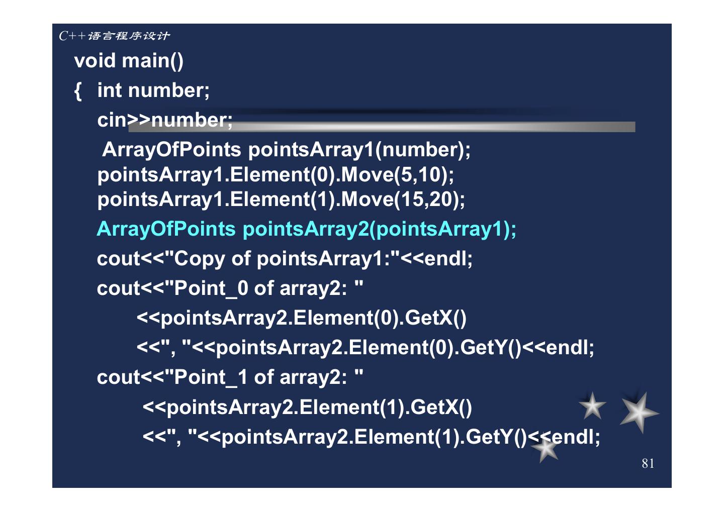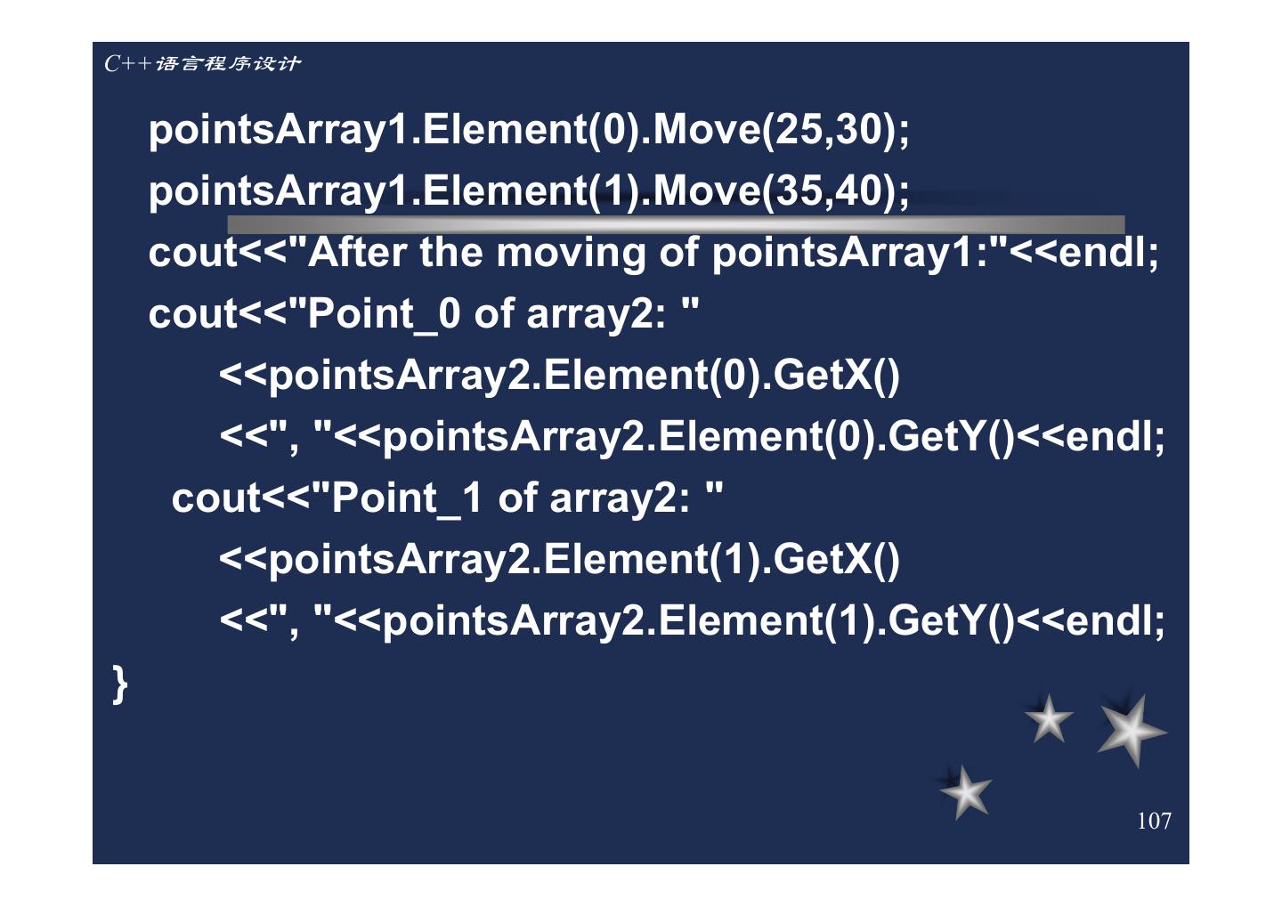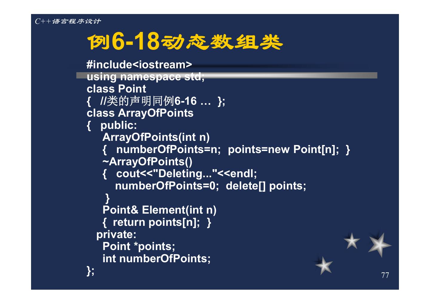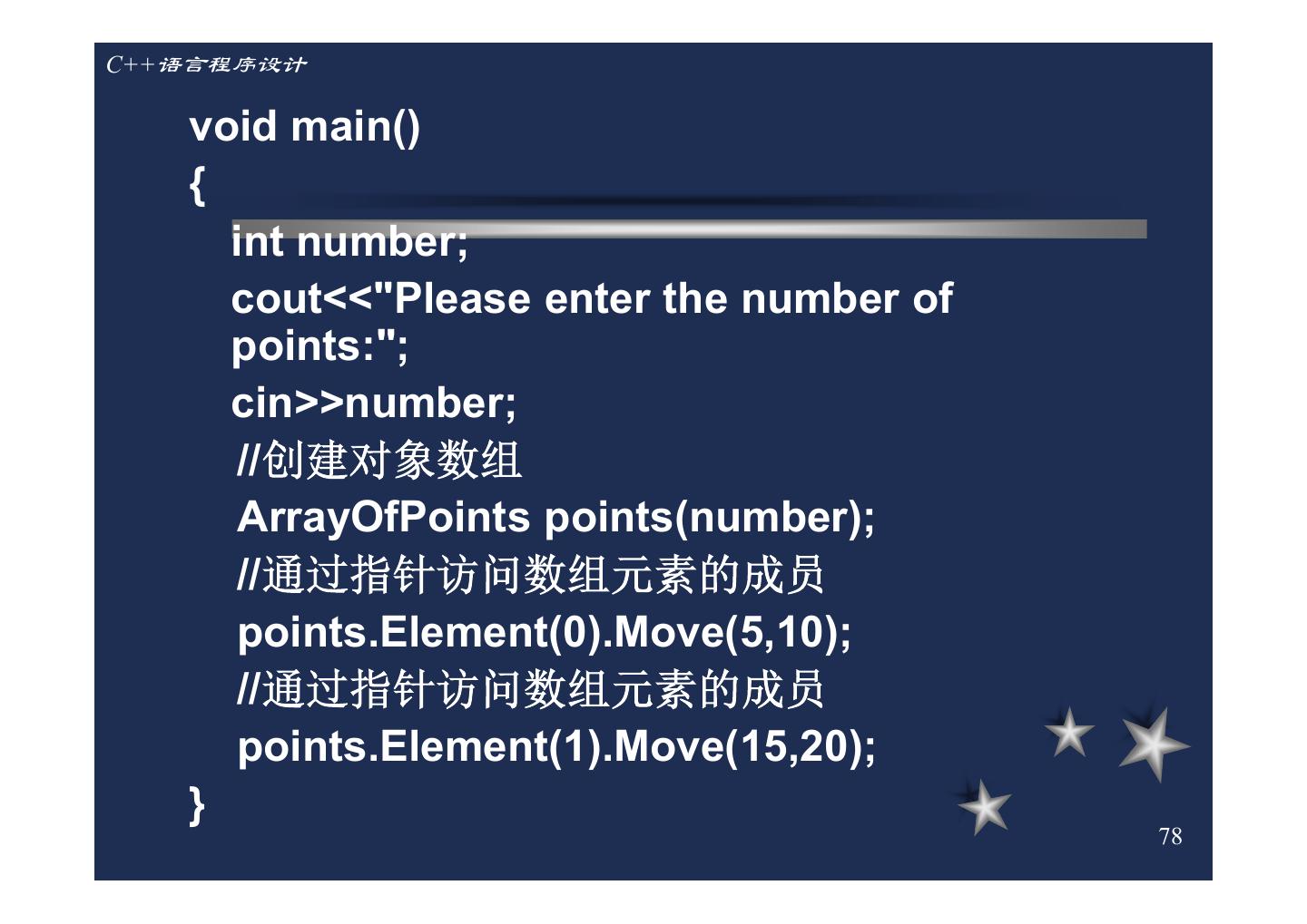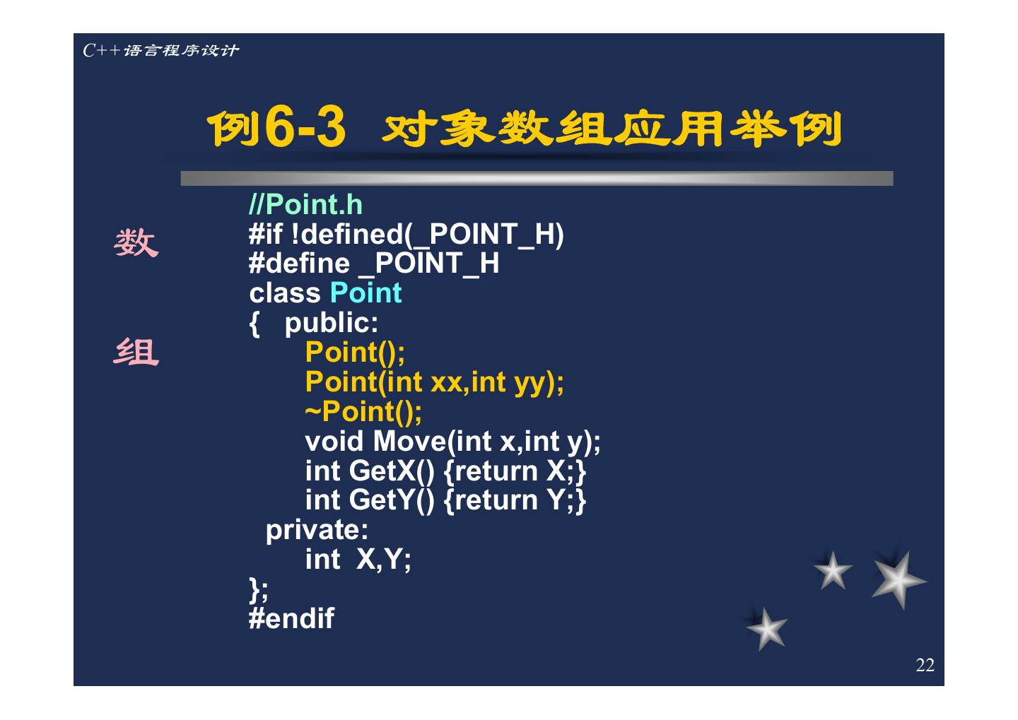 22 .C++语言程序设计 数 例6-3 对象数组应用举例 //Point.h #if !defined(_POINT_H) #define _POINT_H 组 class Point { public: Point(); Point(int xx,int yy); ~Point(); void Move(int x,int y); int GetX() {return X;} int GetY() {return Y;} private: int X,Y; }; #endif 22