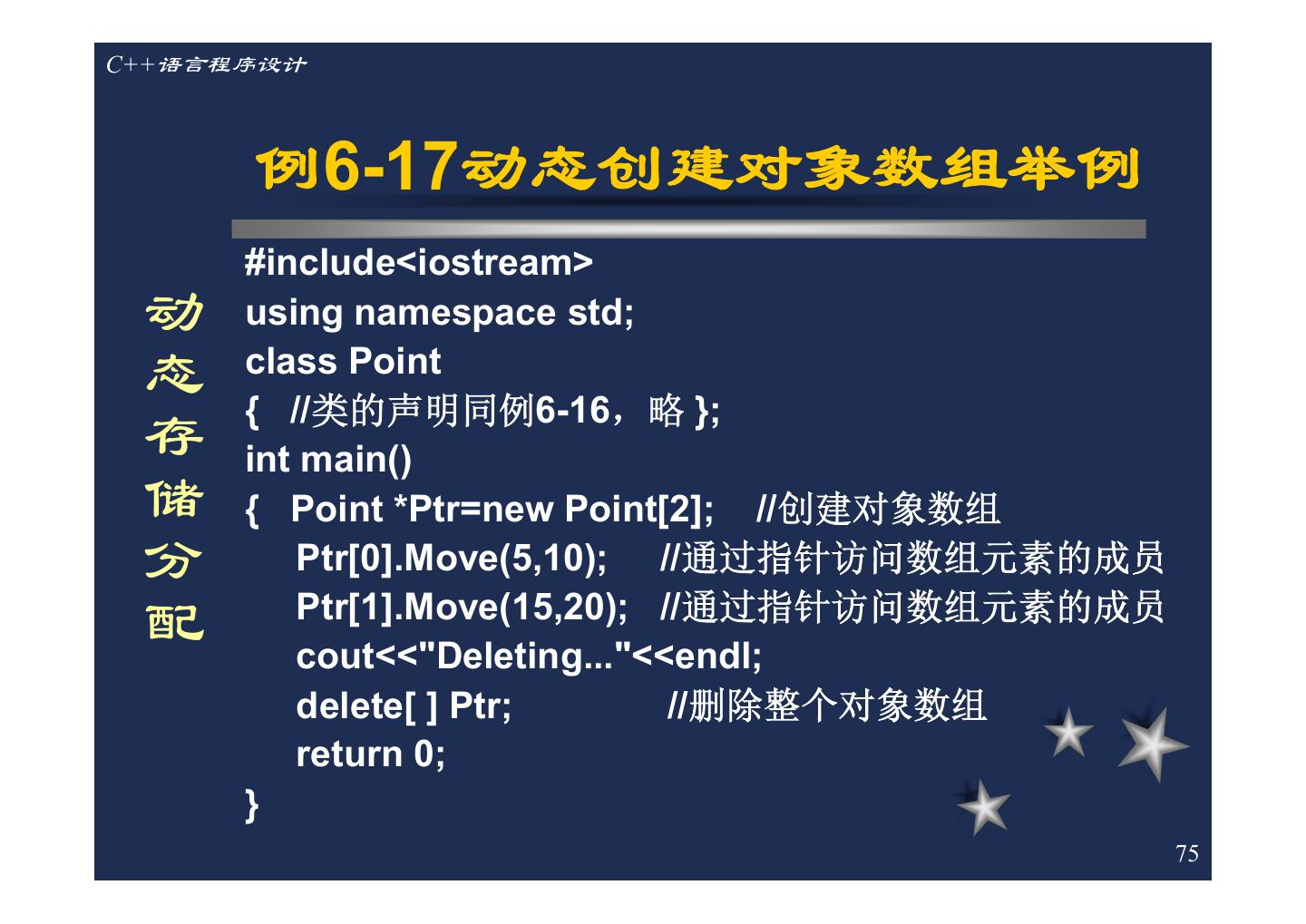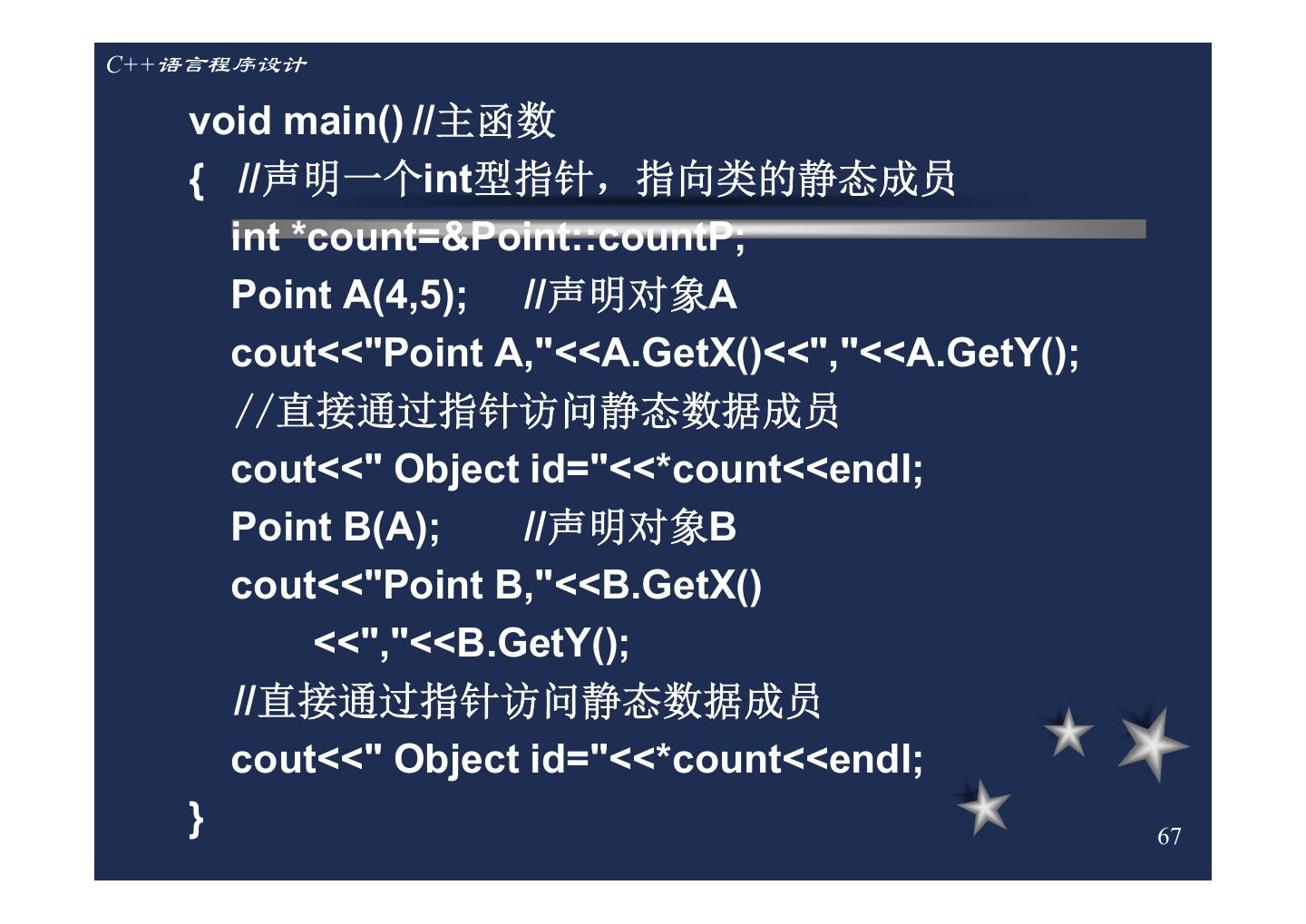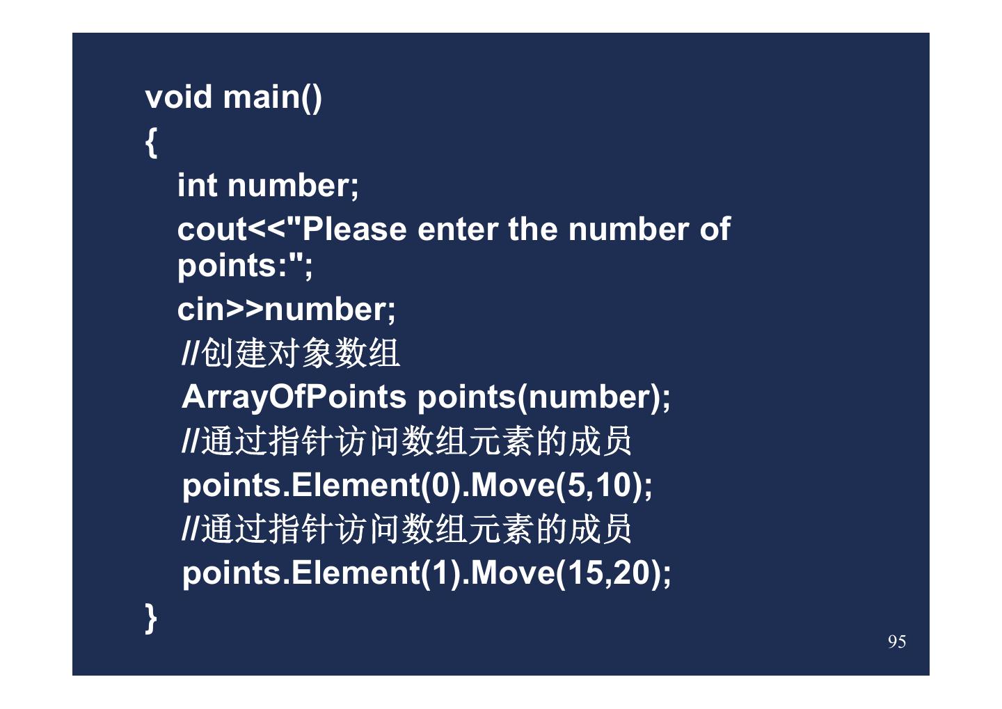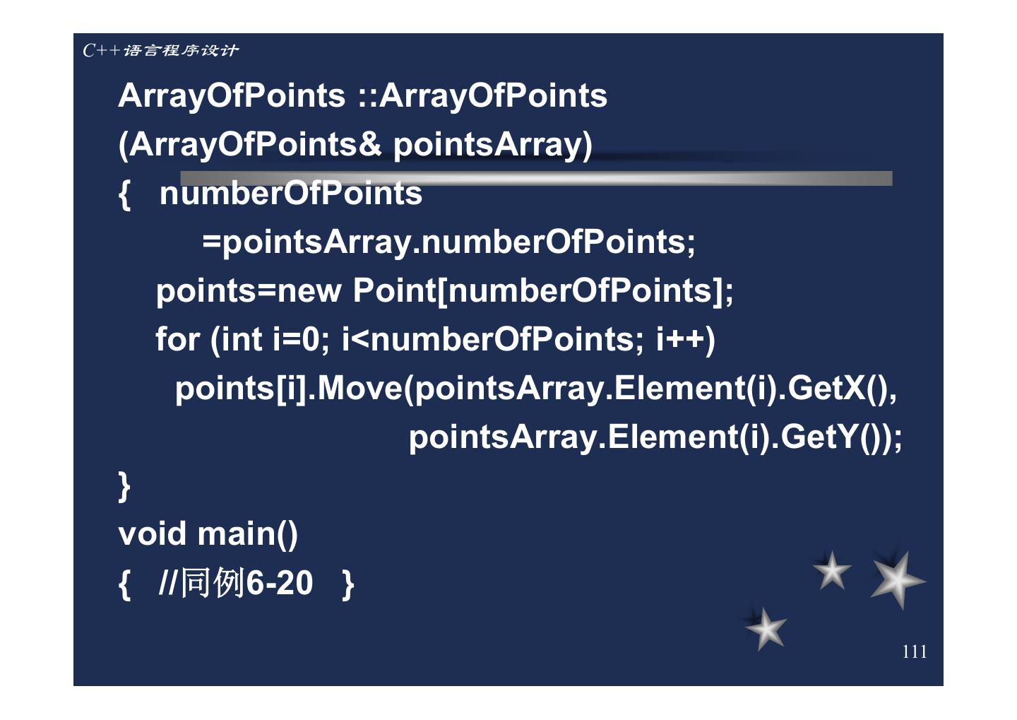 22 .C++语言程序设计 数 例6-3 对象数组应用举例 //Point.h #if !defined(_POINT_H) #define _POINT_H 组 class Point { public: Point(); Point(int xx,int yy); ~Point(); void Move(int x,int y); int GetX() {return X;} int GetY() {return Y;} private: int X,Y; }; #endif 22