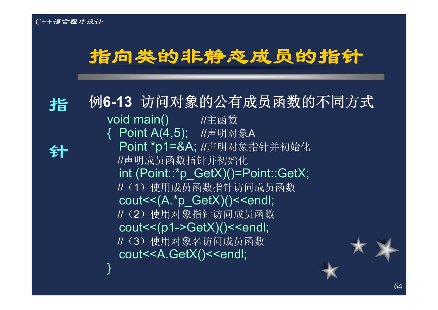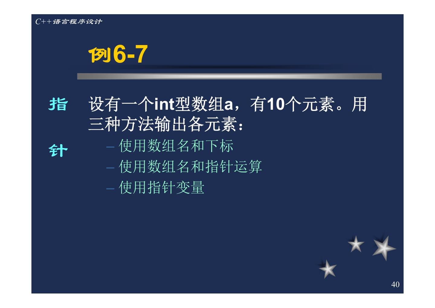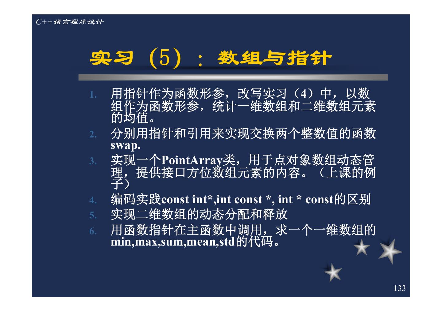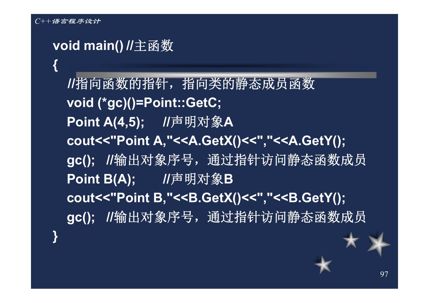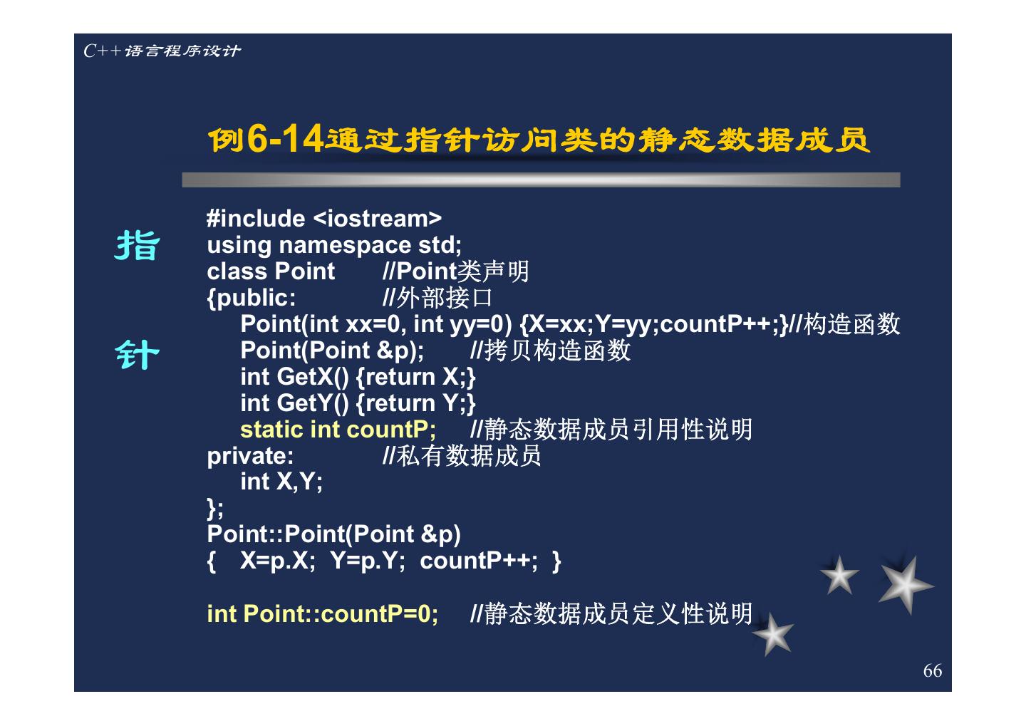 22 .C++语言程序设计 数 例6-3 对象数组应用举例 //Point.h #if !defined(_POINT_H) #define _POINT_H 组 class Point { public: Point(); Point(int xx,int yy); ~Point(); void Move(int x,int y); int GetX() {return X;} int GetY() {return Y;} private: int X,Y; }; #endif 22
