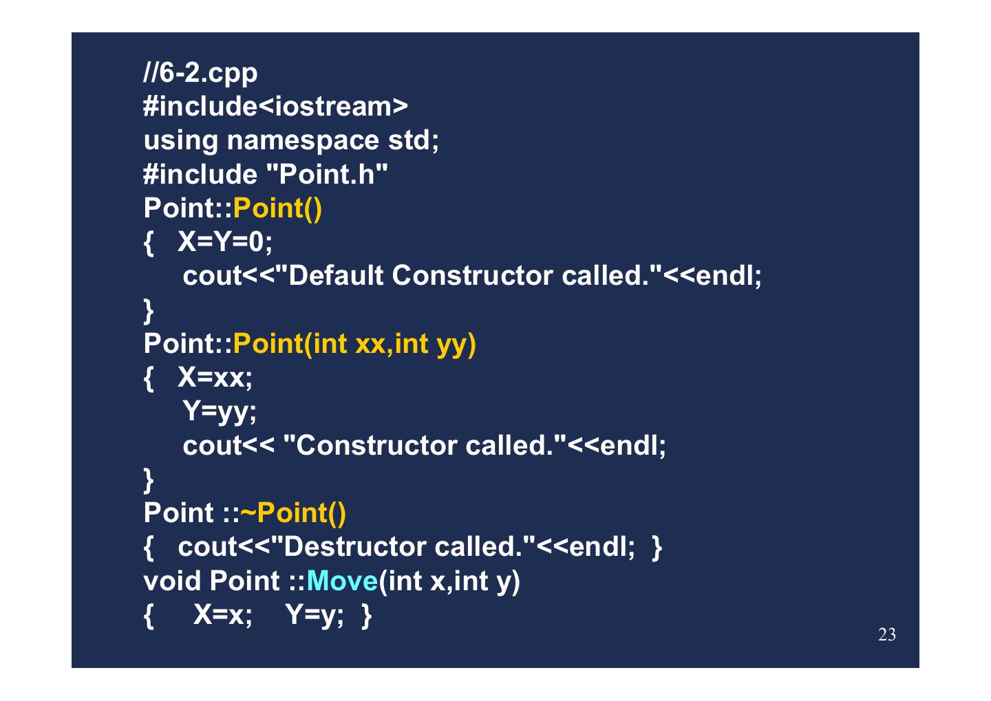 23 .//6-2.cpp #include<iostream> using namespace std; #include "Point.h" Point::Point() { X=Y=0; cout<<"Default Constructor called."<<endl; } Point::Point(int xx,int yy) { X=xx; Y=yy; cout<< "Constructor called."<<endl; } Point ::~Point() { cout<<"Destructor called."<<endl; } void Point ::Move(int x,int y) { X=x; Y=y; } 23