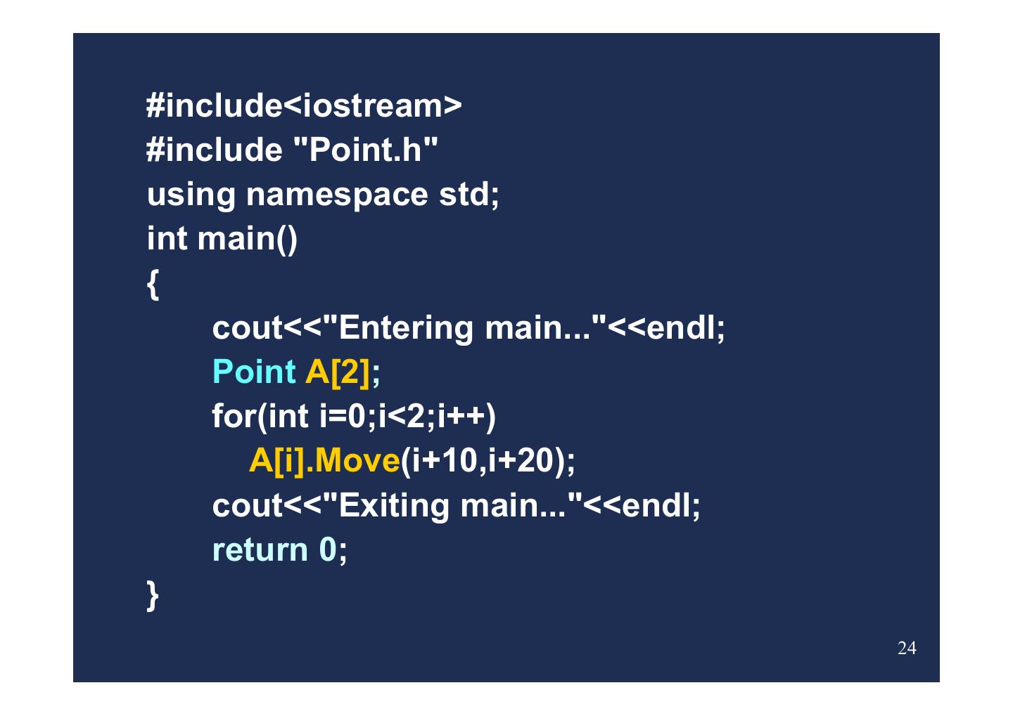 24 .#include<iostream> #include "Point.h" using namespace std; int main() { cout<<"Entering main..."<<endl; Point A[2]; for(int i=0;i<2;i++) A[i].Move(i+10,i+20); cout<<"Exiting main..."<<endl; return 0; } 24