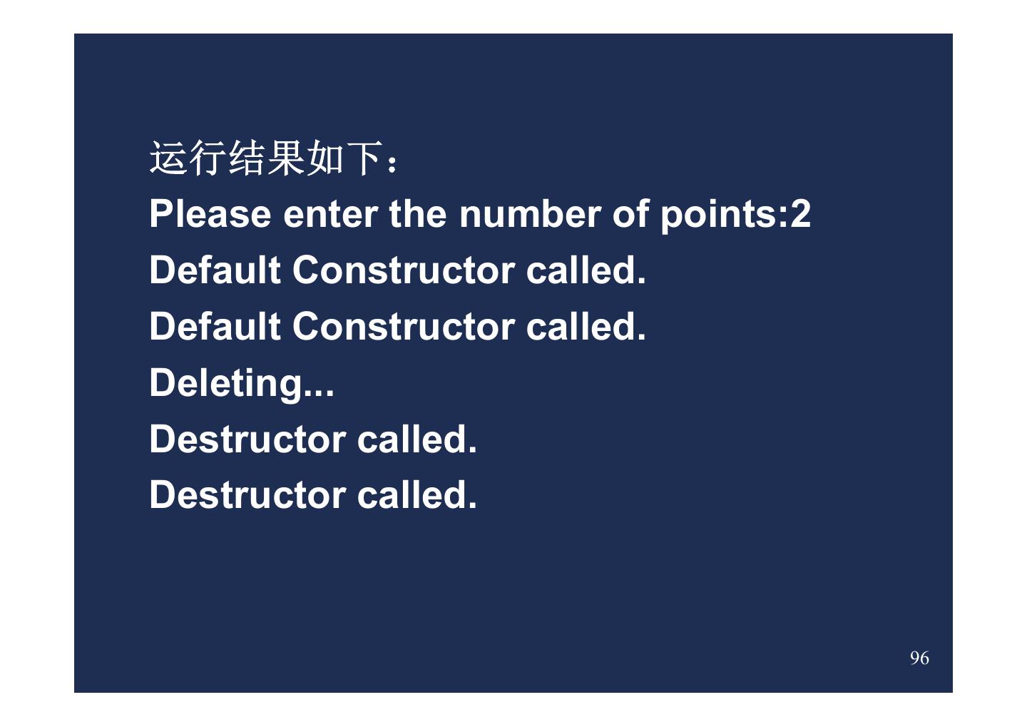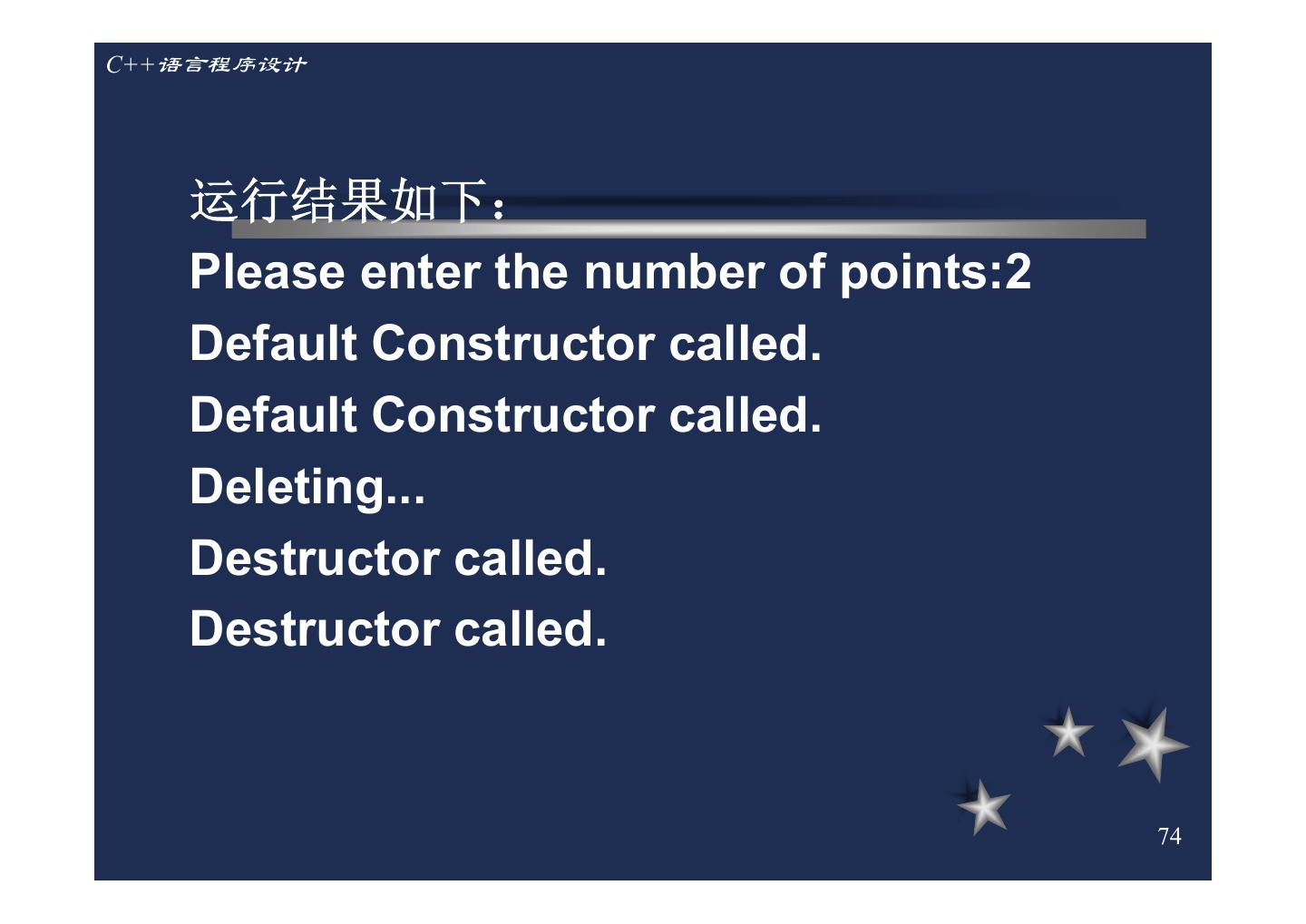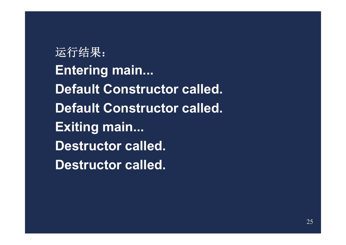 25 .运行结果: Entering main... Default Constructor called. Default Constructor called. Exiting main... Destructor called. Destructor called. 25