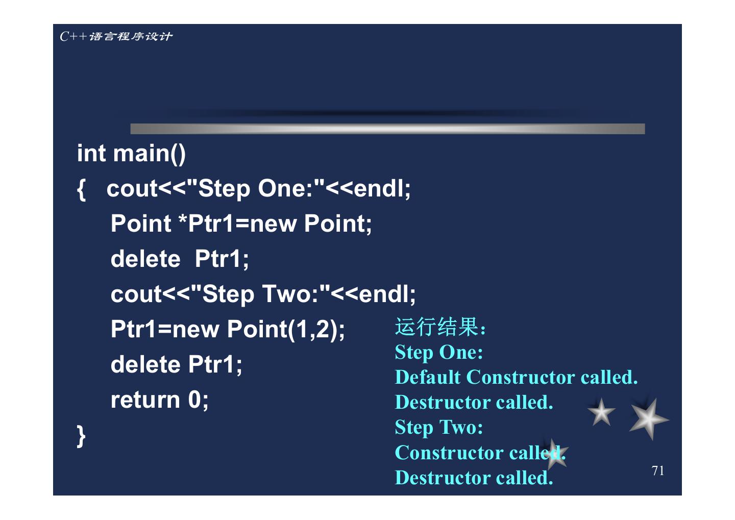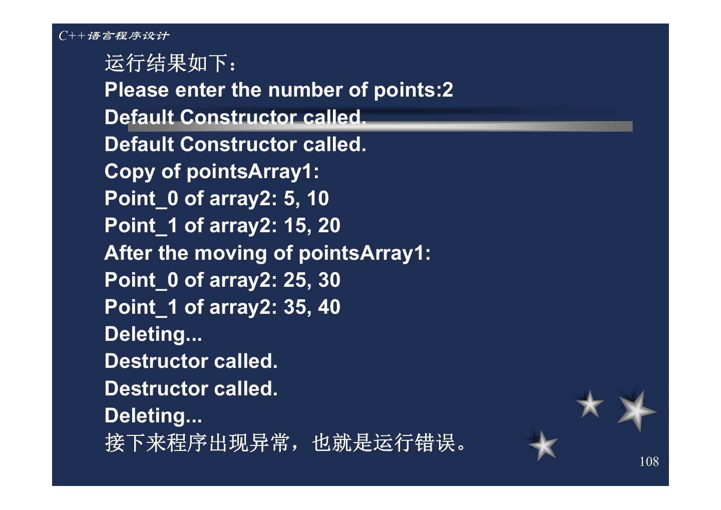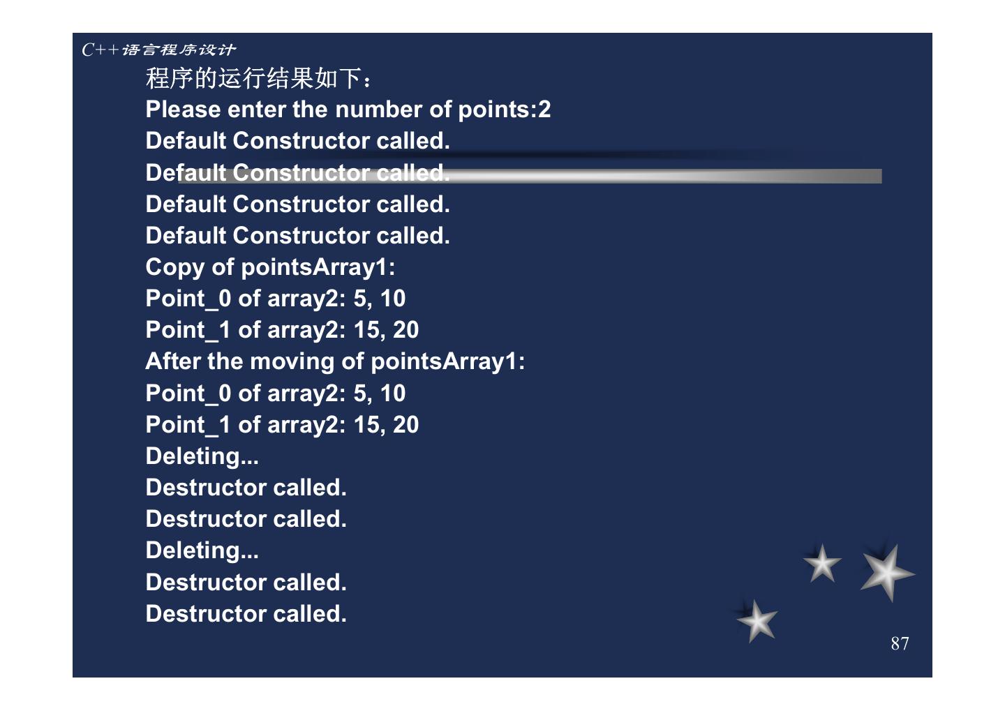 25 .运行结果: Entering main... Default Constructor called. Default Constructor called. Exiting main... Destructor called. Destructor called. 25