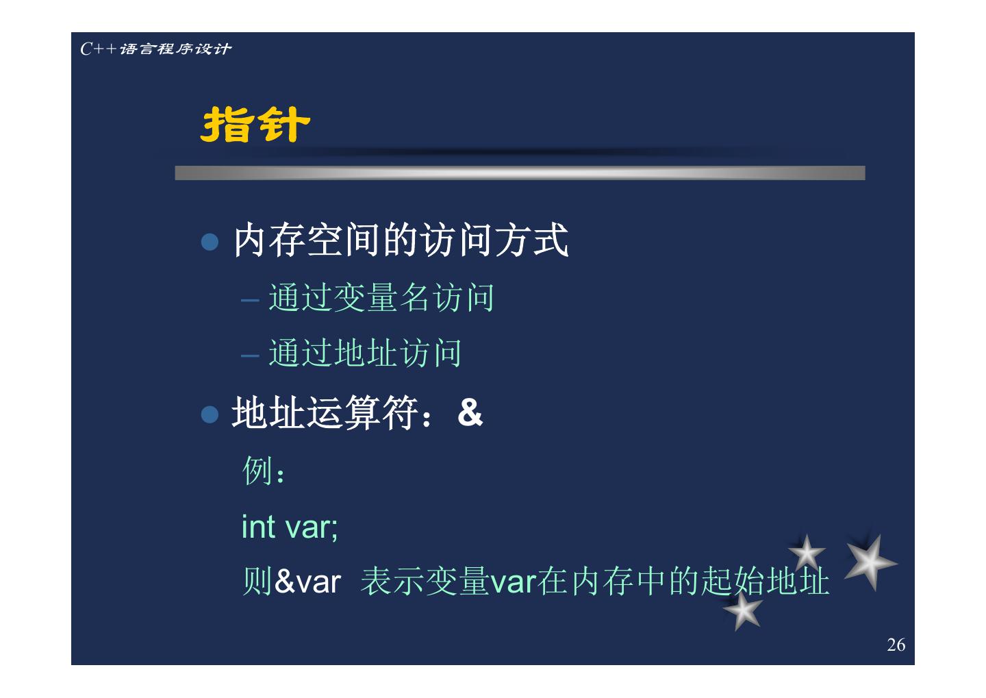 26 .C++语言程序设计 指针 内存空间的访问方式 – 通过变量名访问 – 通过地址访问 地址运算符:& 例: int var; 则&var 表示变量var在内存中的起始地址 26
