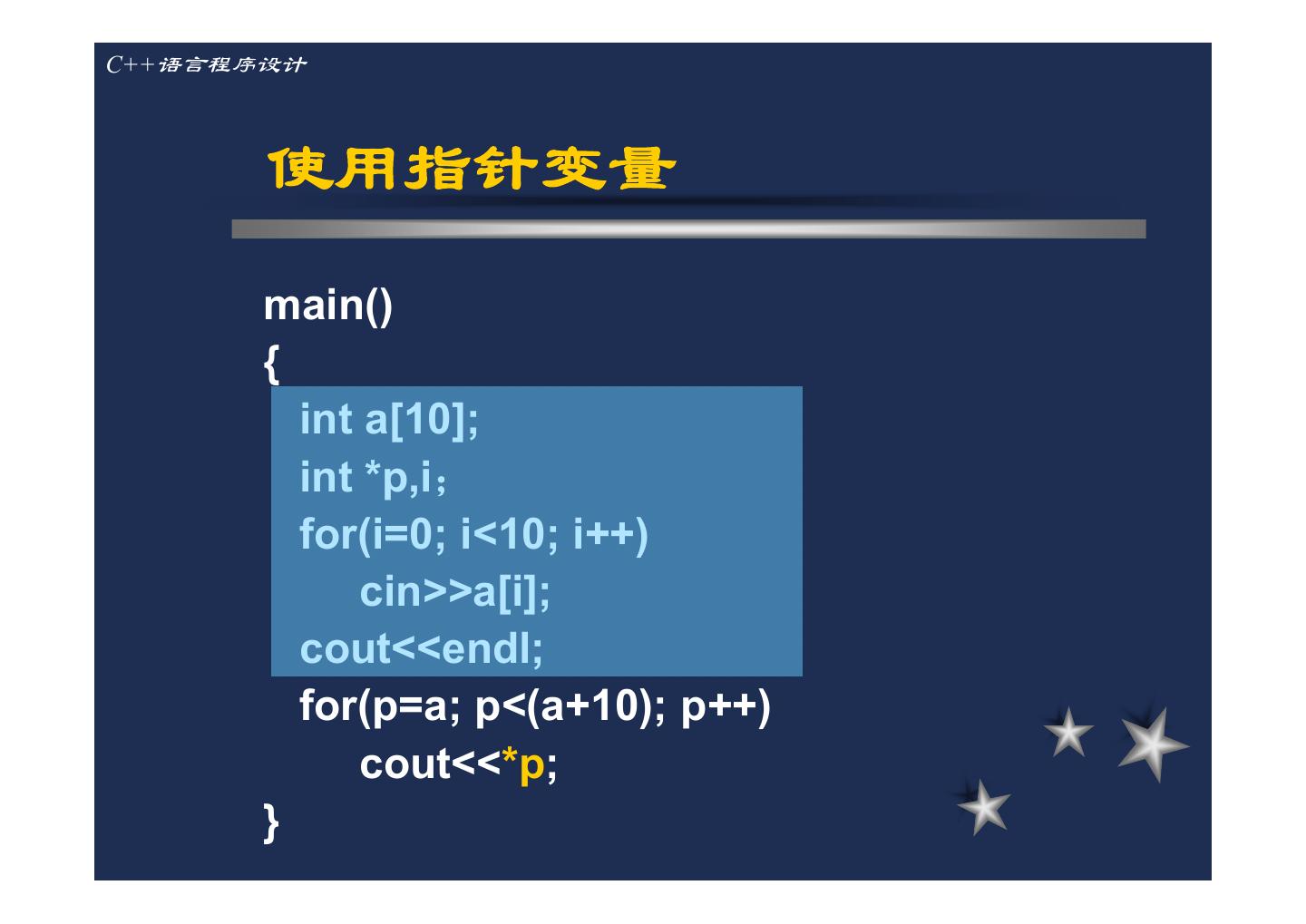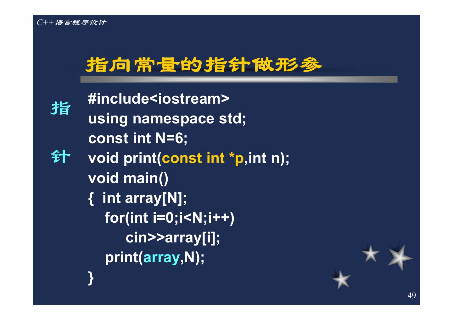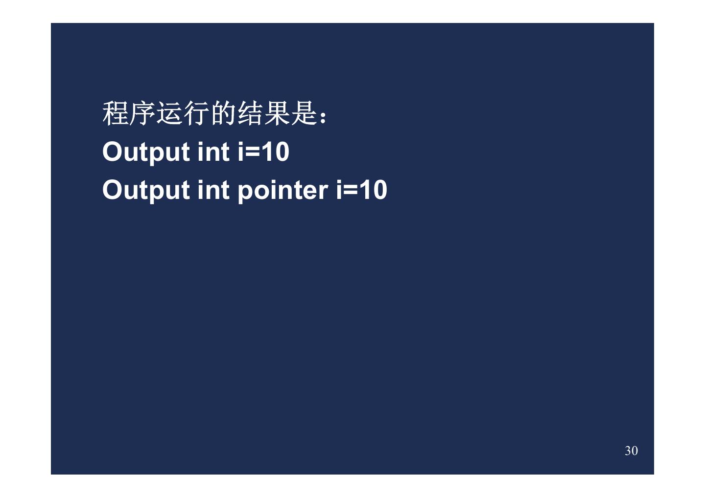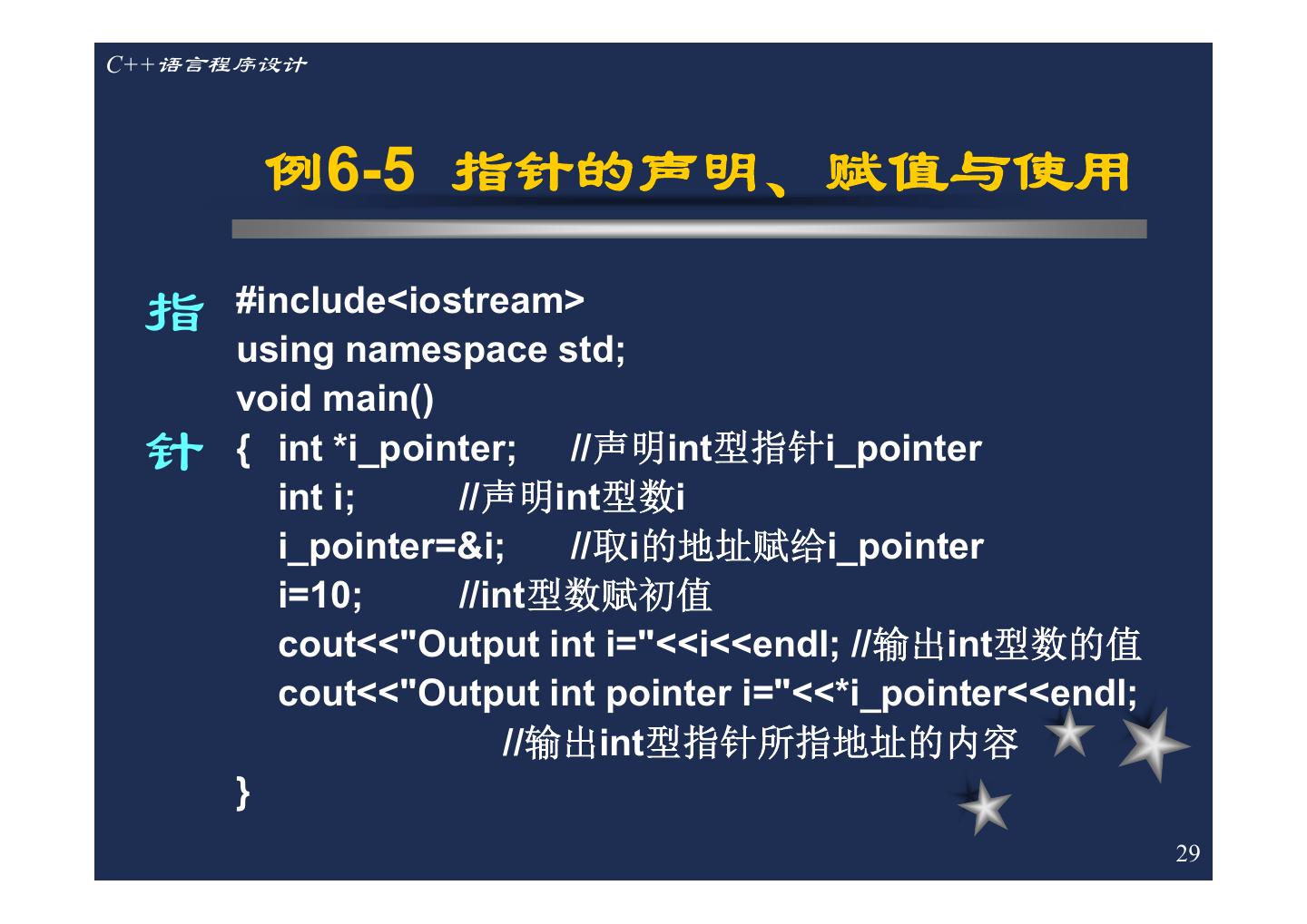 29 .C++语言程序设计 指 例6-5 指针的声明、赋值与使用 #include<iostream> using namespace std; 针 void main() { int *i_pointer; //声明int型指针i_pointer int i; //声明int型数i i_pointer=&i; //取i的地址赋给i_pointer i=10; //int型数赋初值 cout<<"Output int i="<<i<<endl; //输出int型数的值 cout<<"Output int pointer i="<<*i_pointer<<endl; //输出int型指针所指地址的内容 } 29