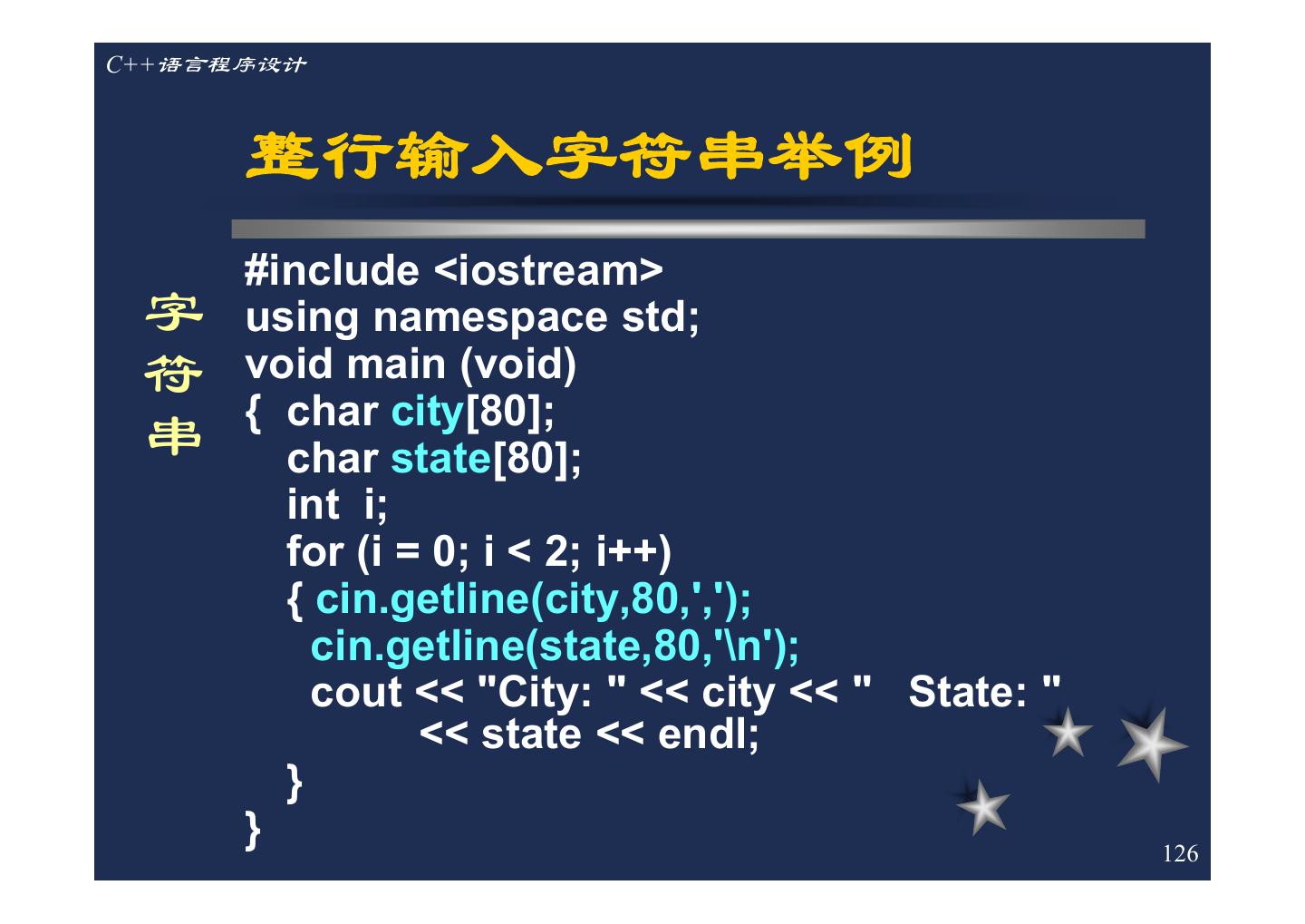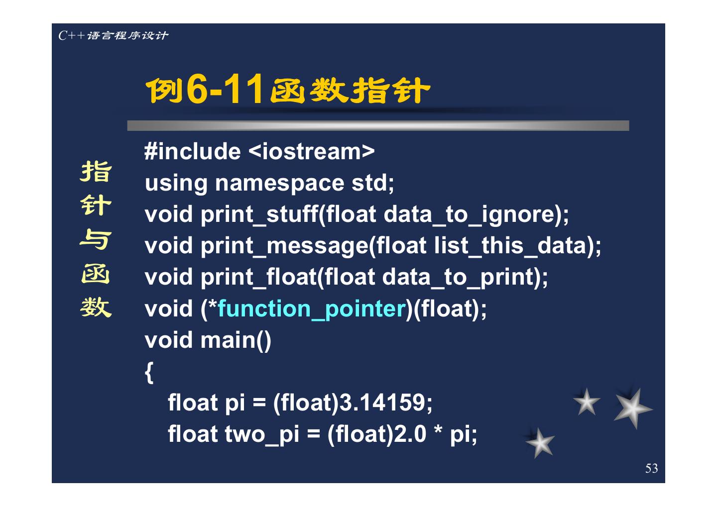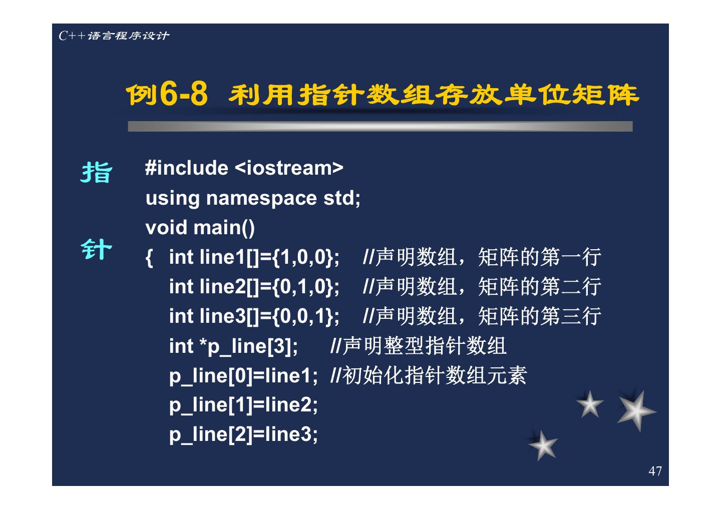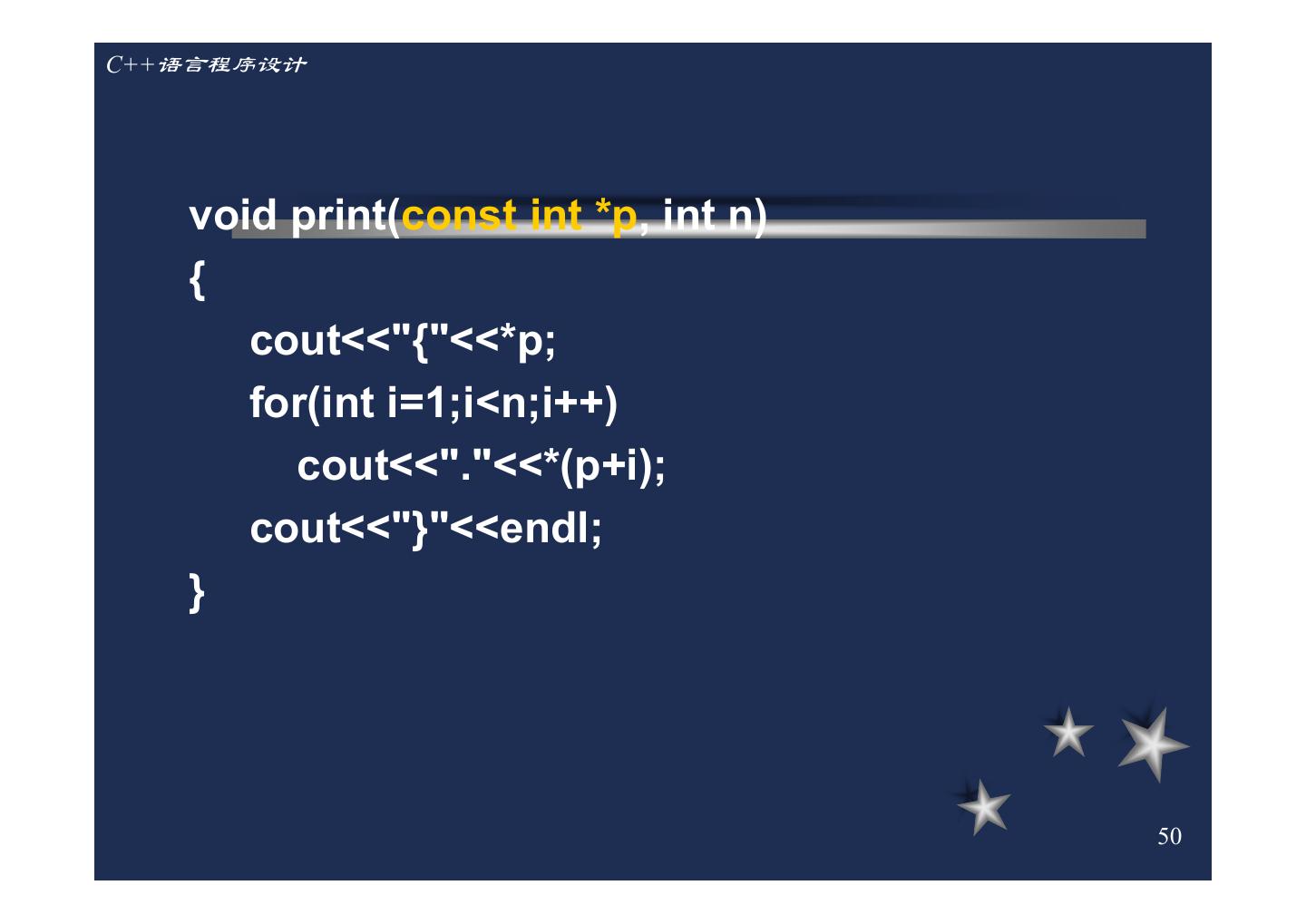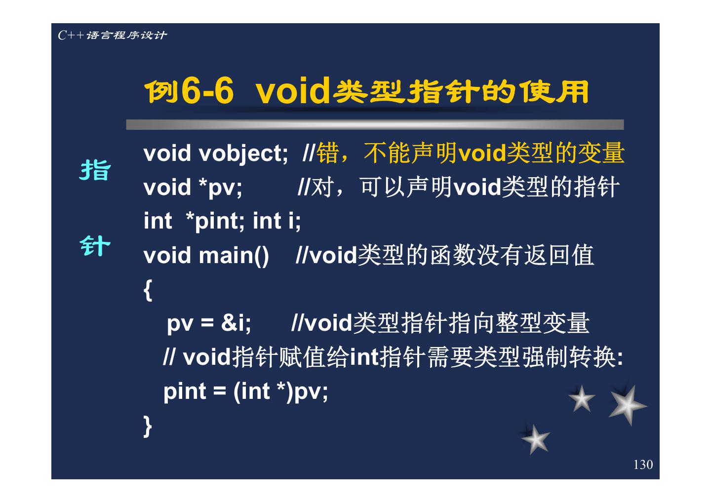 29 .C++语言程序设计 指 例6-5 指针的声明、赋值与使用 #include<iostream> using namespace std; 针 void main() { int *i_pointer; //声明int型指针i_pointer int i; //声明int型数i i_pointer=&i; //取i的地址赋给i_pointer i=10; //int型数赋初值 cout<<"Output int i="<<i<<endl; //输出int型数的值 cout<<"Output int pointer i="<<*i_pointer<<endl; //输出int型指针所指地址的内容 } 29