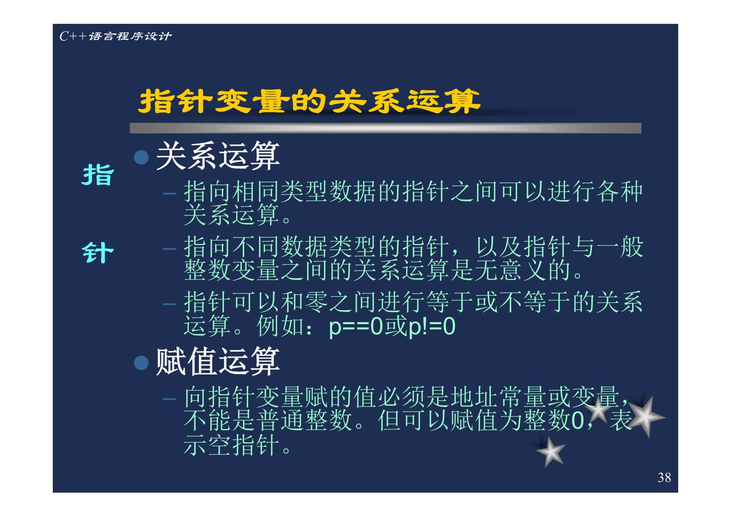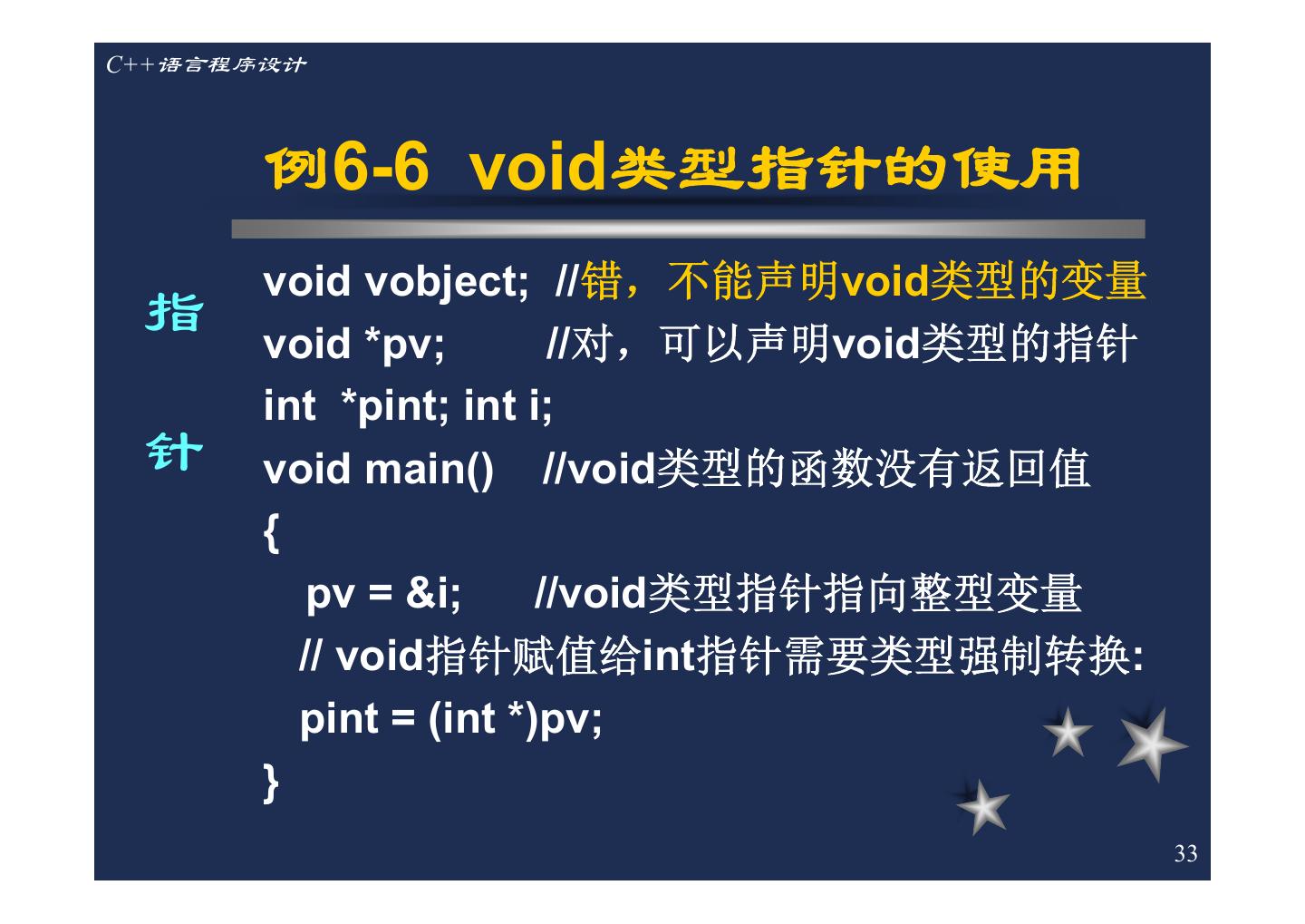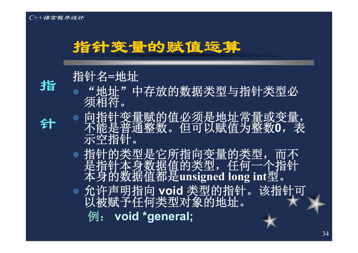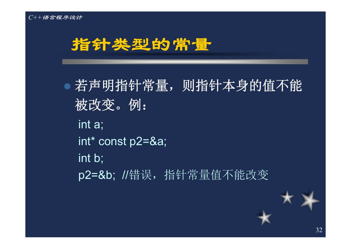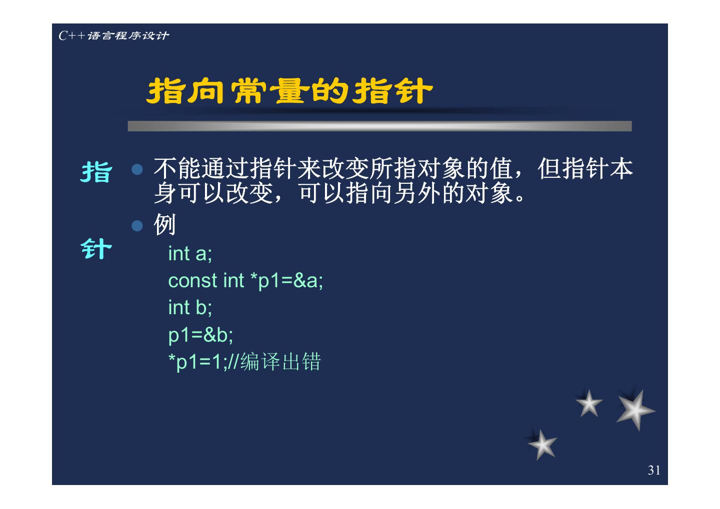 28 .C++语言程序设计 指 指针变量的初始化 语法形式 存储类型 数据类型 *指针名=初始地址; 针 例: int *pa=&a; 28