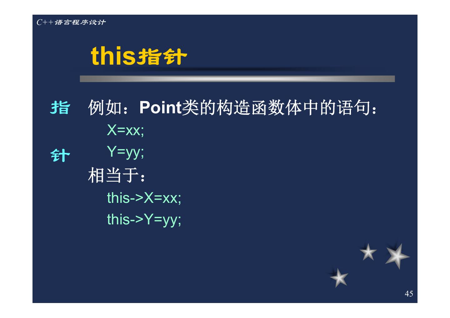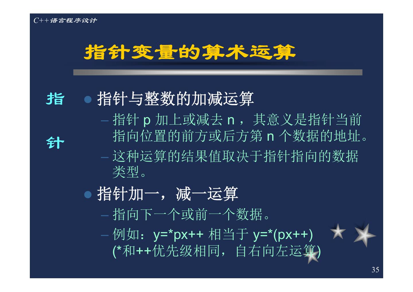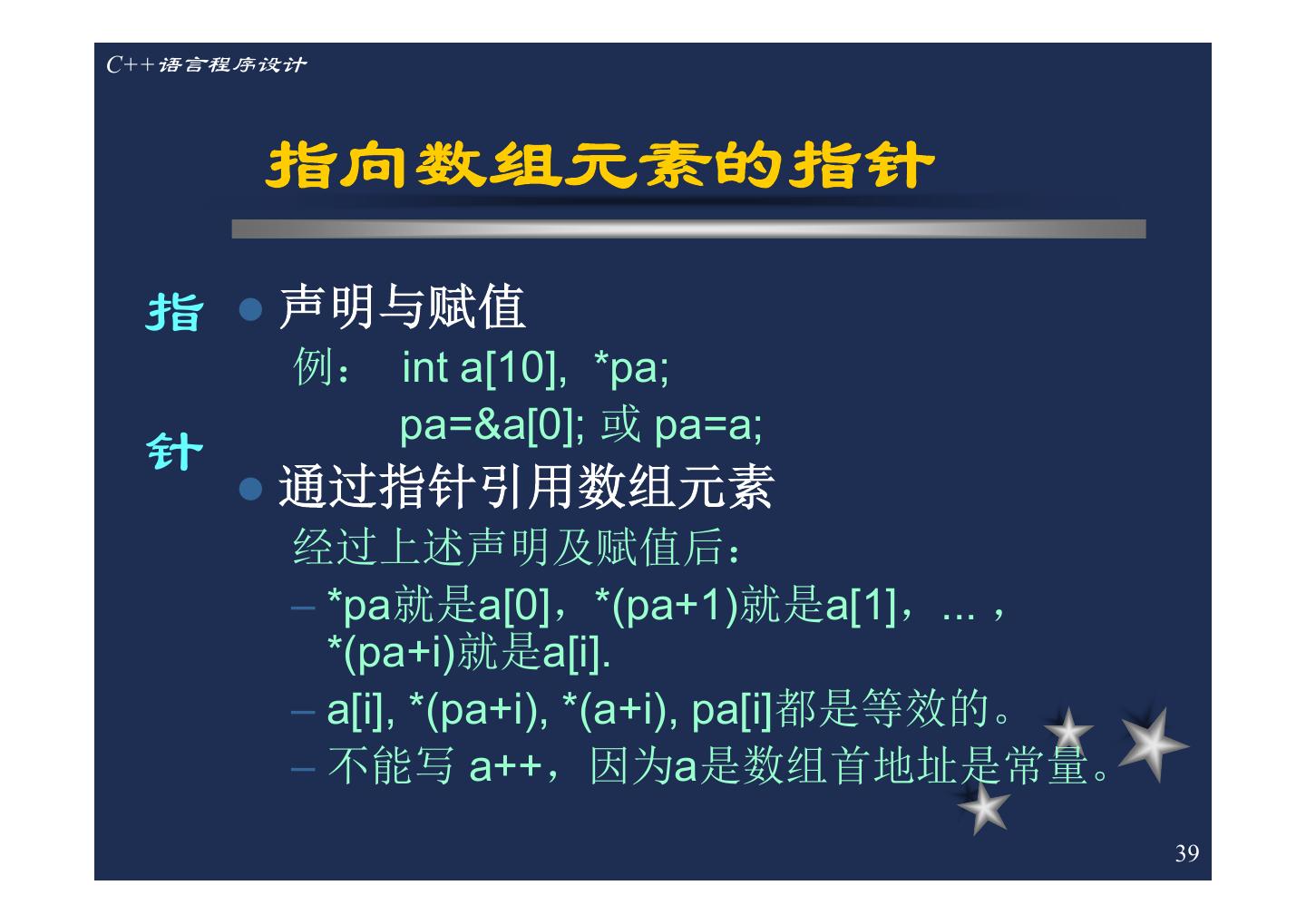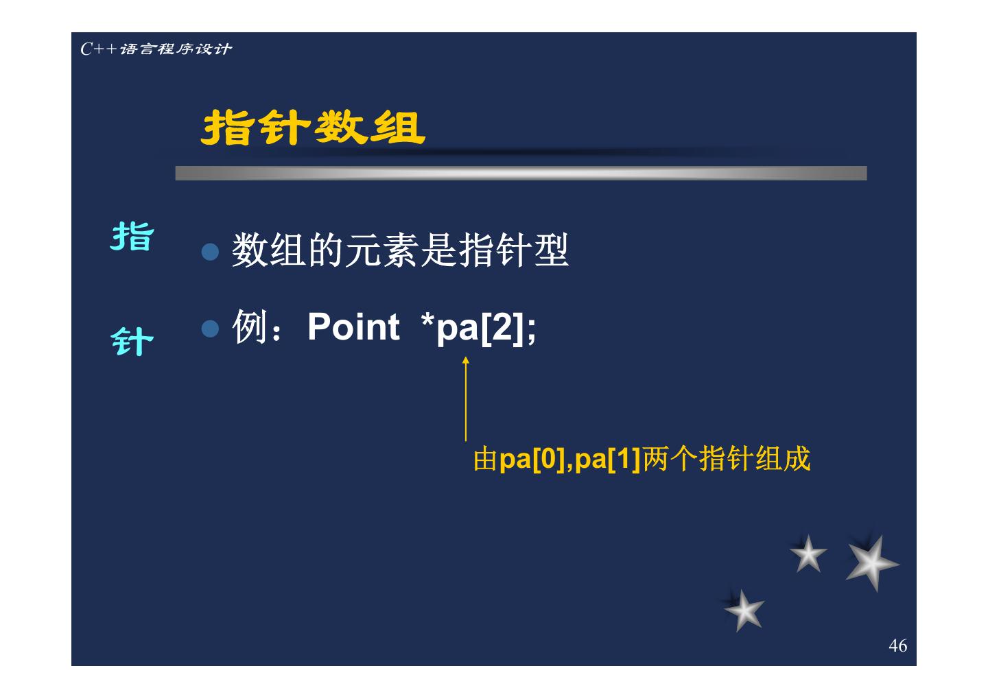 28 .C++语言程序设计 指 指针变量的初始化 语法形式 存储类型 数据类型 *指针名=初始地址; 针 例: int *pa=&a; 28