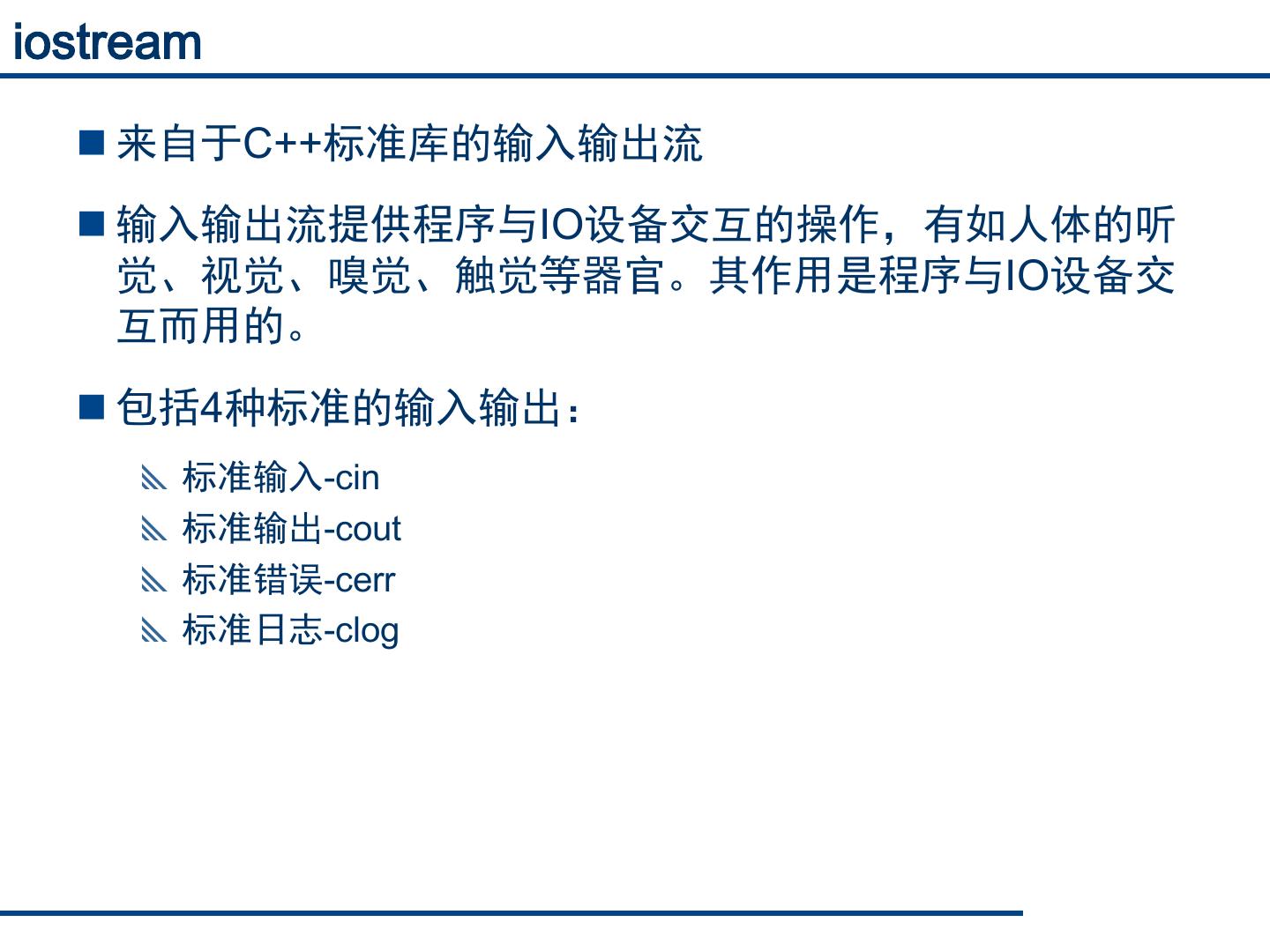 7 .iostream 来自于C++标准库的输入输出流 输入输出流提供程序与IO设备交互的操作,有如人体的听 觉、视觉、嗅觉、触觉等器官。其作用是程序与IO设备交 互而用的。 包括4种标准的输入输出: 标准输入-cin 标准输出-cout 标准错误-cerr 标准日志-clog