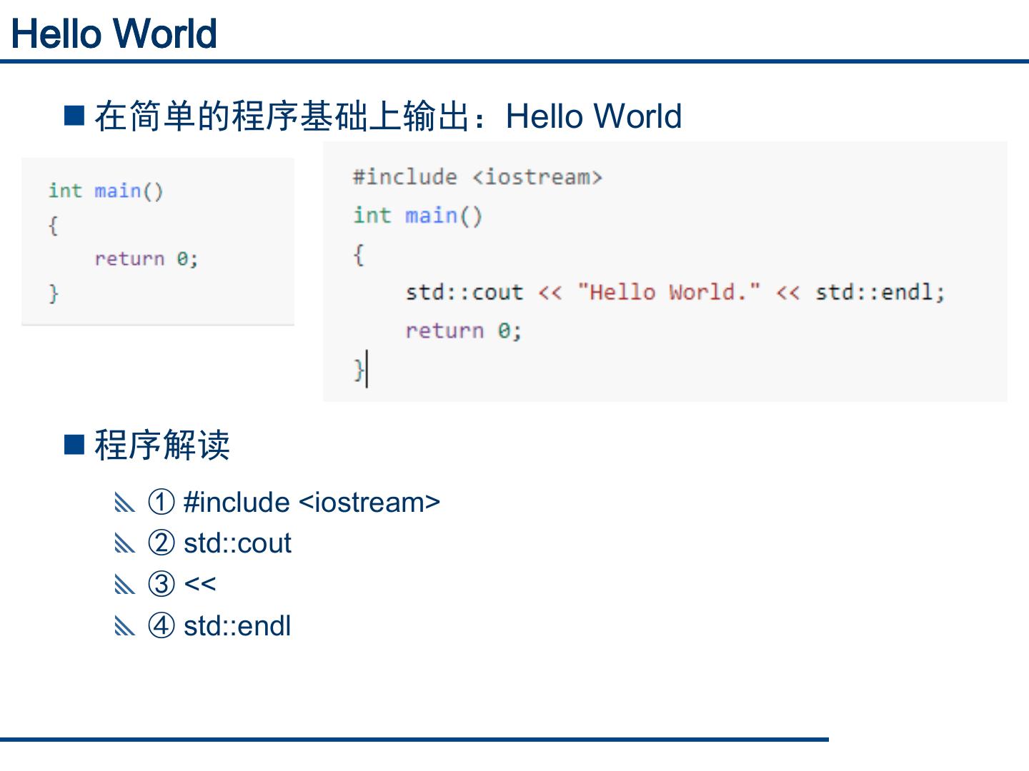 8 .Hello World 在简单的程序基础上输出:Hello World 程序解读 ① #include <iostream> ② std::cout ③ << ④ std::endl