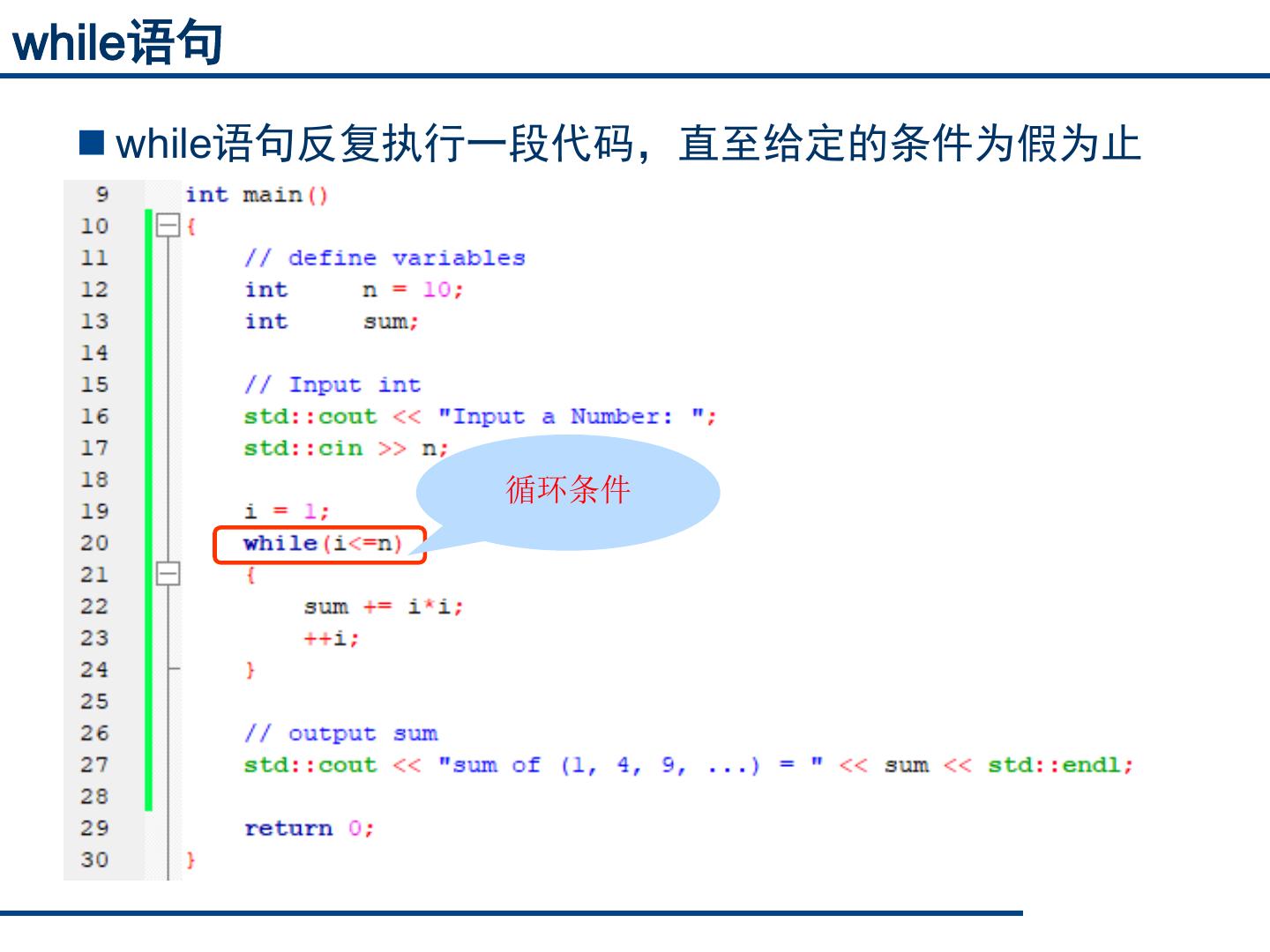 17 .while语句 while语句反复执行一段代码,直至给定的条件为假为止 循环条件