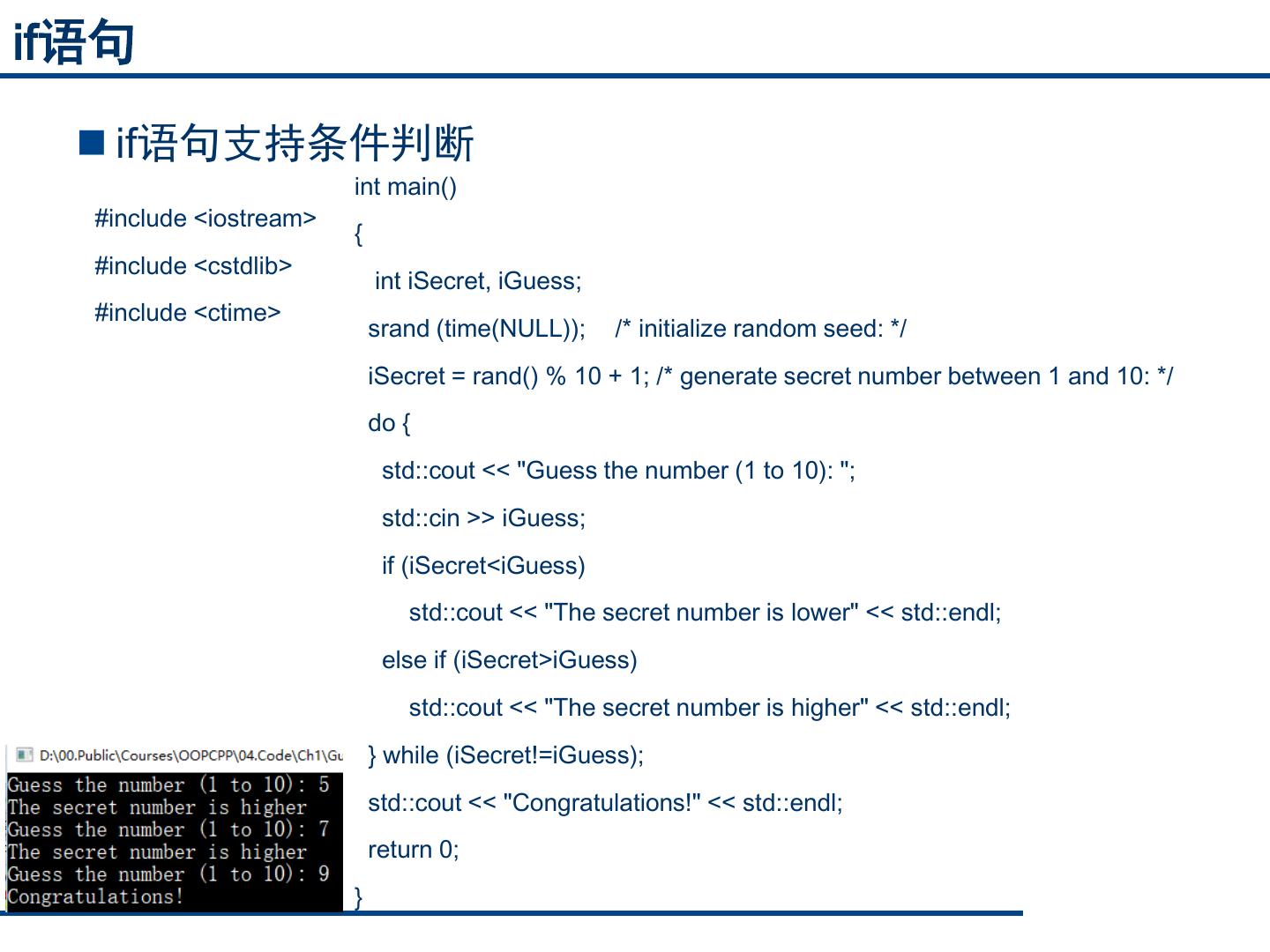 19 .if语句 if语句支持条件判断 int main() #include <iostream> { #include <cstdlib> int iSecret, iGuess; #include <ctime> srand (time(NULL)); /* initialize random seed: */ iSecret = rand() % 10 + 1; /* generate secret number between 1 and 10: */ do { std::cout << "Guess the number (1 to 10): "; std::cin >> iGuess; if (iSecret<iGuess) std::cout << "The secret number is lower" << std::endl; else if (iSecret>iGuess) std::cout << "The secret number is higher" << std::endl; } while (iSecret!=iGuess); std::cout << "Congratulations!" << std::endl; return 0; }