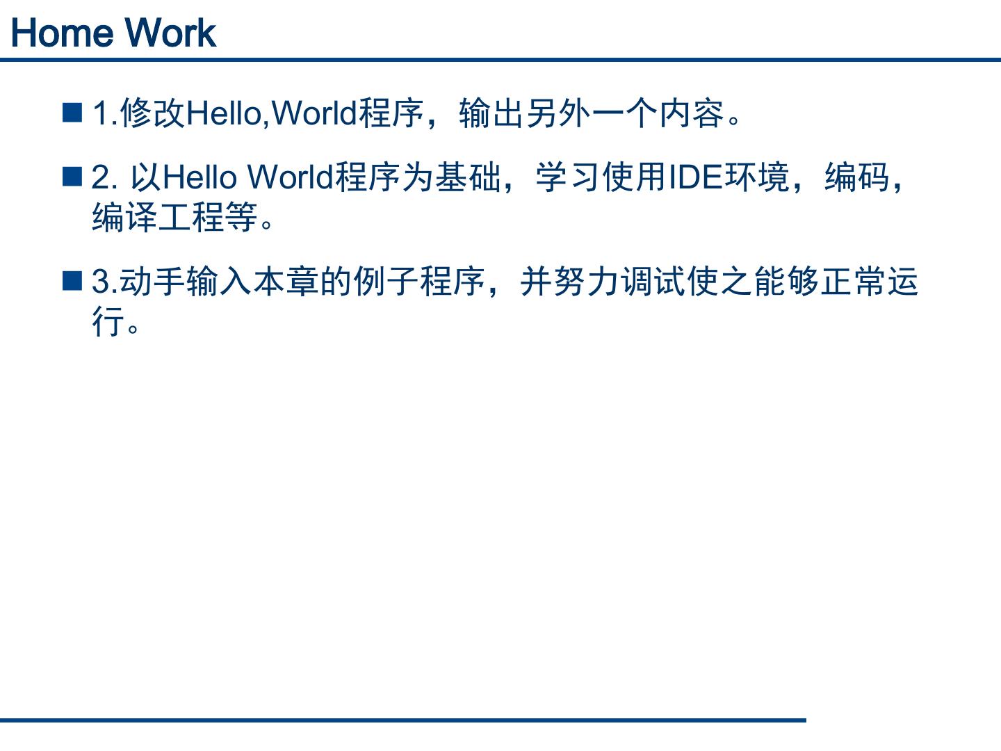 23 .Home Work 1.修改Hello,World程序,输出另外一个内容。 2. 以Hello World程序为基础,学习使用IDE环境,编码, 编译工程等。 3.动手输入本章的例子程序,并努力调试使之能够正常运 行。