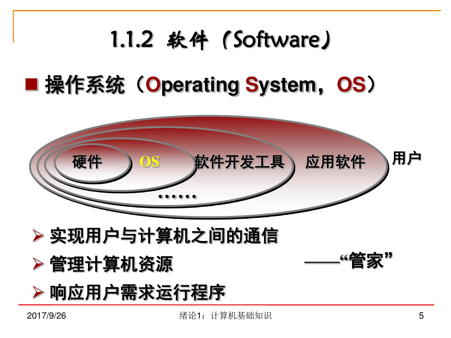 5 . 1.1.2 软件(Software) 操作系统(Operating System,OS) 硬件 OS 软件开发工具 应用软件 用户 …… 实现用户与计算机之间的通信 管理计算机资源 ——“管家” 响应用户需求运行程序 2017/9/26 绪论1:计算机基础知识 5