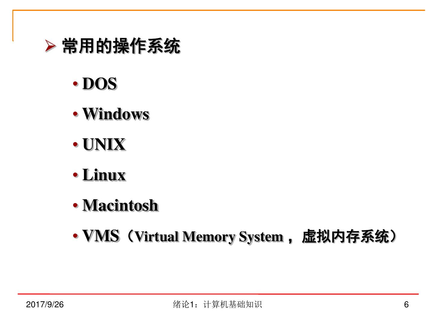 6 . 常用的操作系统 • DOS • Windows • UNIX • Linux • Macintosh • VMS(Virtual Memory System ,虚拟内存系统) 2017/9/26 绪论1:计算机基础知识 6