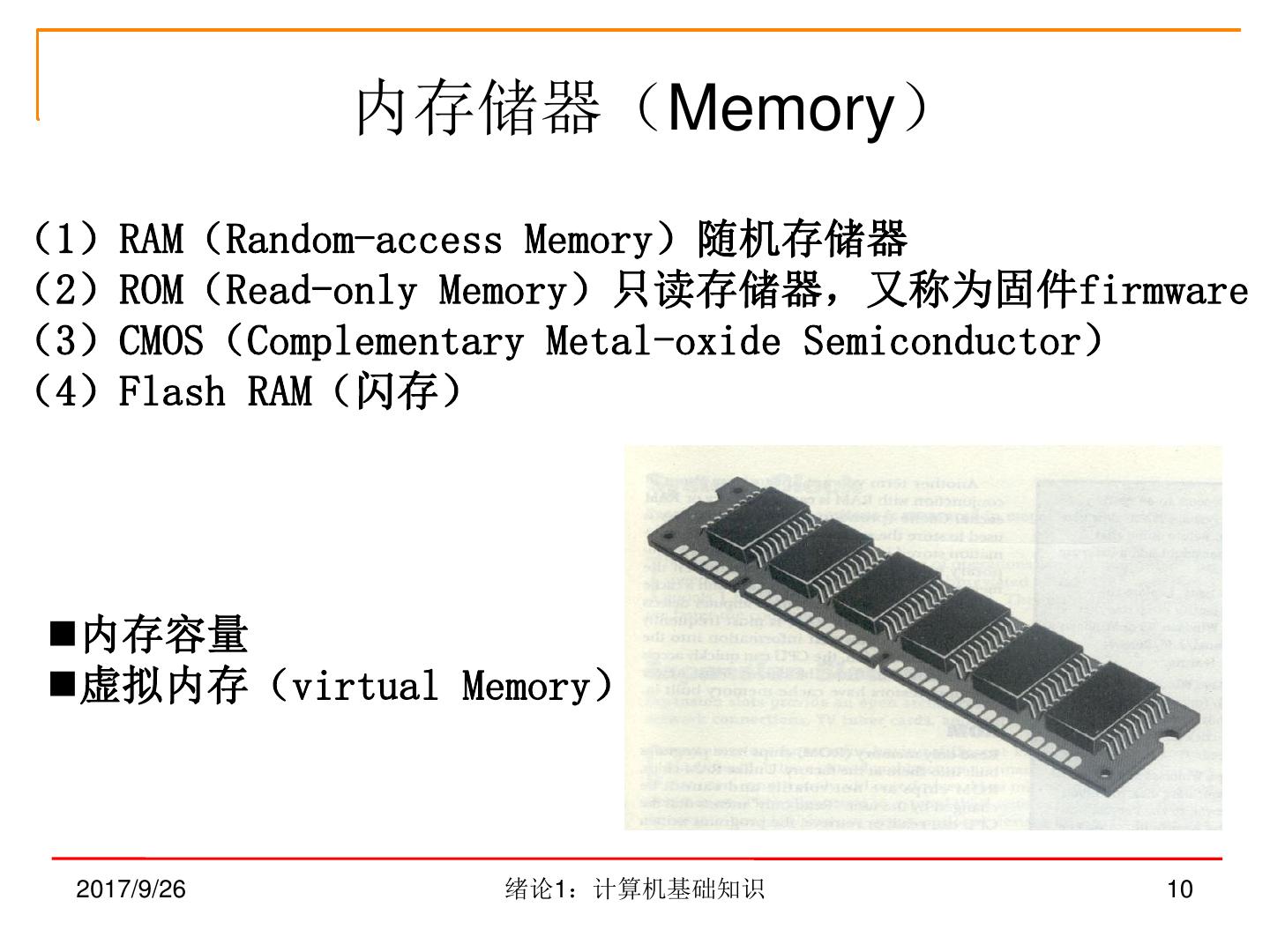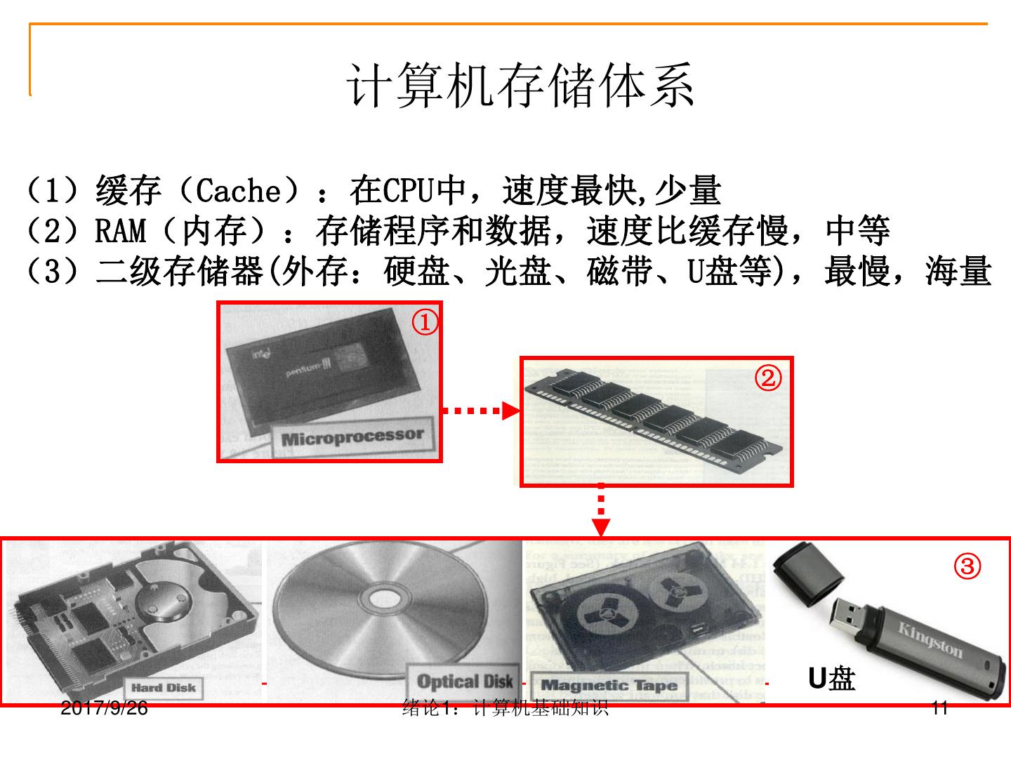10 . 内存储器(Memory) (1)RAM(Random-access Memory)随机存储器 (2)ROM(Read-only Memory)只读存储器,又称为固件firmware (3)CMOS(Complementary Metal-oxide Semiconductor) (4)Flash RAM(闪存) 内存容量 虚拟内存(virtual Memory) 2017/9/26 绪论1:计算机基础知识 10