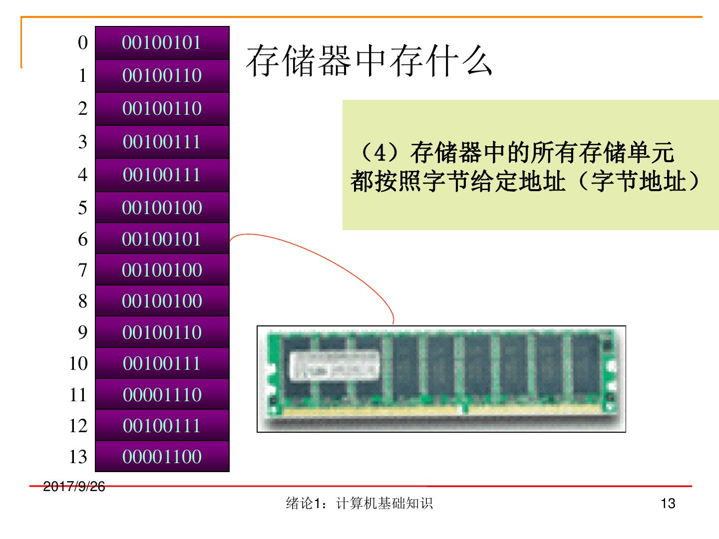 13 . 0 00100101 1 00100110 存储器中存什么 2 00100110 3 00100111 (4)存储器中的所有存储单元 4 00100111 都按照字节给定地址(字节地址) 5 00100100 6 00100101 7 00100100 8 00100100 9 00100110 10 00100111 11 00001110 12 00100111 13 00001100 2017/9/26 绪论1:计算机基础知识 13