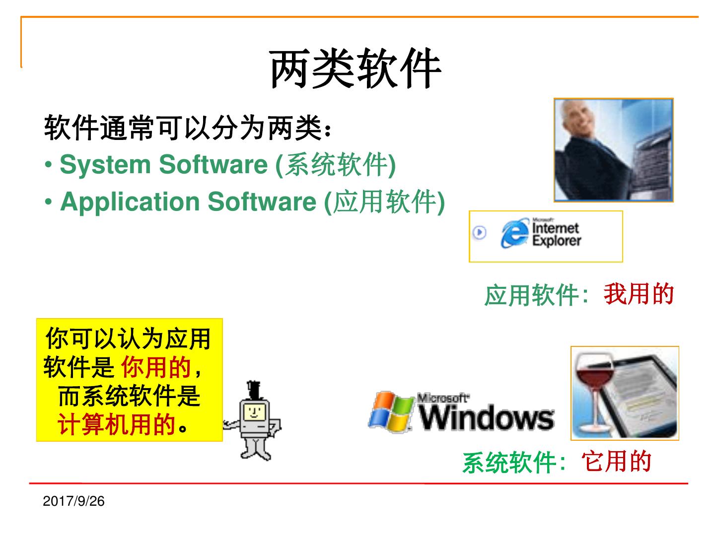 16 . 两类软件 软件通常可以分为两类: • System Software (系统软件) • Application Software (应用软件) 应用软件:我用的 你可以认为应用 软件是 你用的, 而系统软件是 计算机用的。 系统软件:它用的 2017/9/26