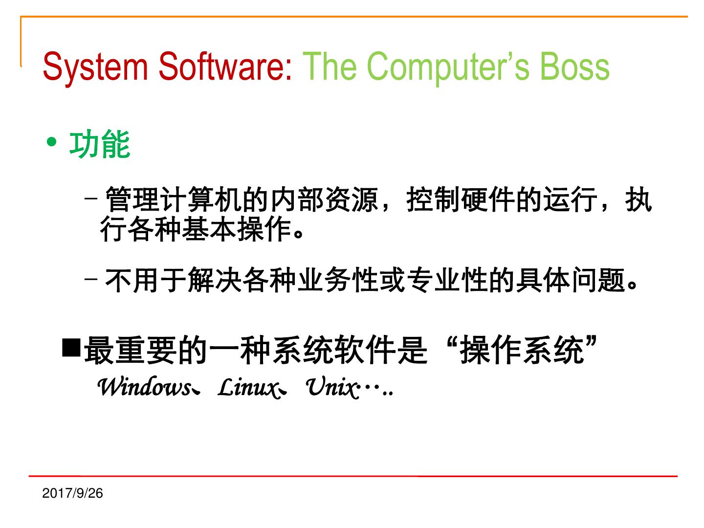 17 .System Software: The Computer’s Boss • 功能 –管理计算机的内部资源,控制硬件的运行,执 行各种基本操作。 –不用于解决各种业务性或专业性的具体问题。 最重要的一种系统软件是“操作系统” Windows、Linux、Unix….. 2017/9/26
