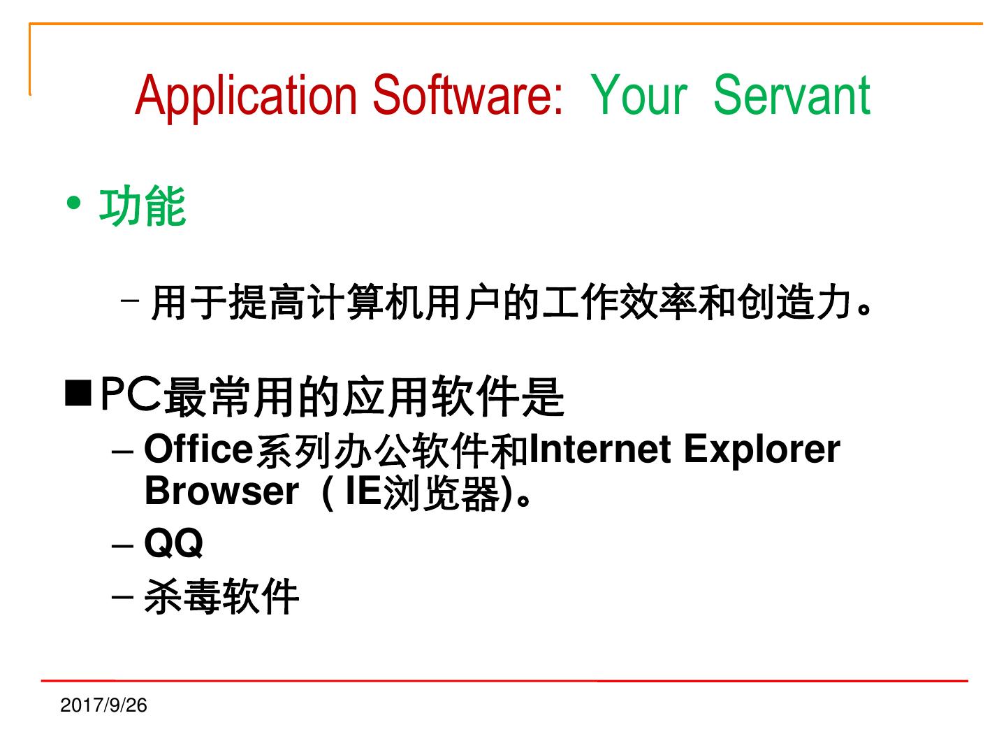18 . Application Software: Your Servant • 功能 –用于提高计算机用户的工作效率和创造力。 PC最常用的应用软件是 – Office系列办公软件和Internet Explorer Browser ( IE浏览器)。 – QQ – 杀毒软件 2017/9/26