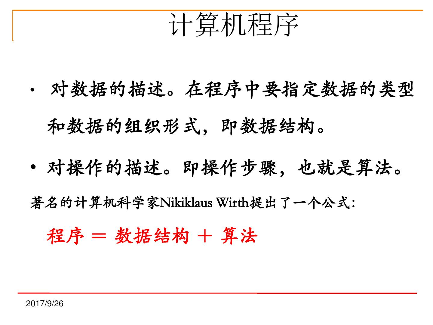 21 . 计算机程序 • 对数据的描述。在程序中要指定数据的类型 和数据的组织形式,即数据结构。 • 对操作的描述。即操作步骤,也就是算法。 著名的计算机科学家Nikiklaus Wirth提出了一个公式: 程序 = 数据结构 + 算法 2017/9/26