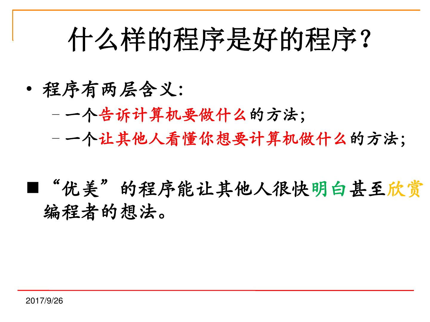 22 . 什么样的程序是好的程序? • 程序有两层含义: –一个告诉计算机要做什么的方法; –一个让其他人看懂你想要计算机做什么的方法; “优美”的程序能让其他人很快明白甚至欣赏 编程者的想法。 2017/9/26