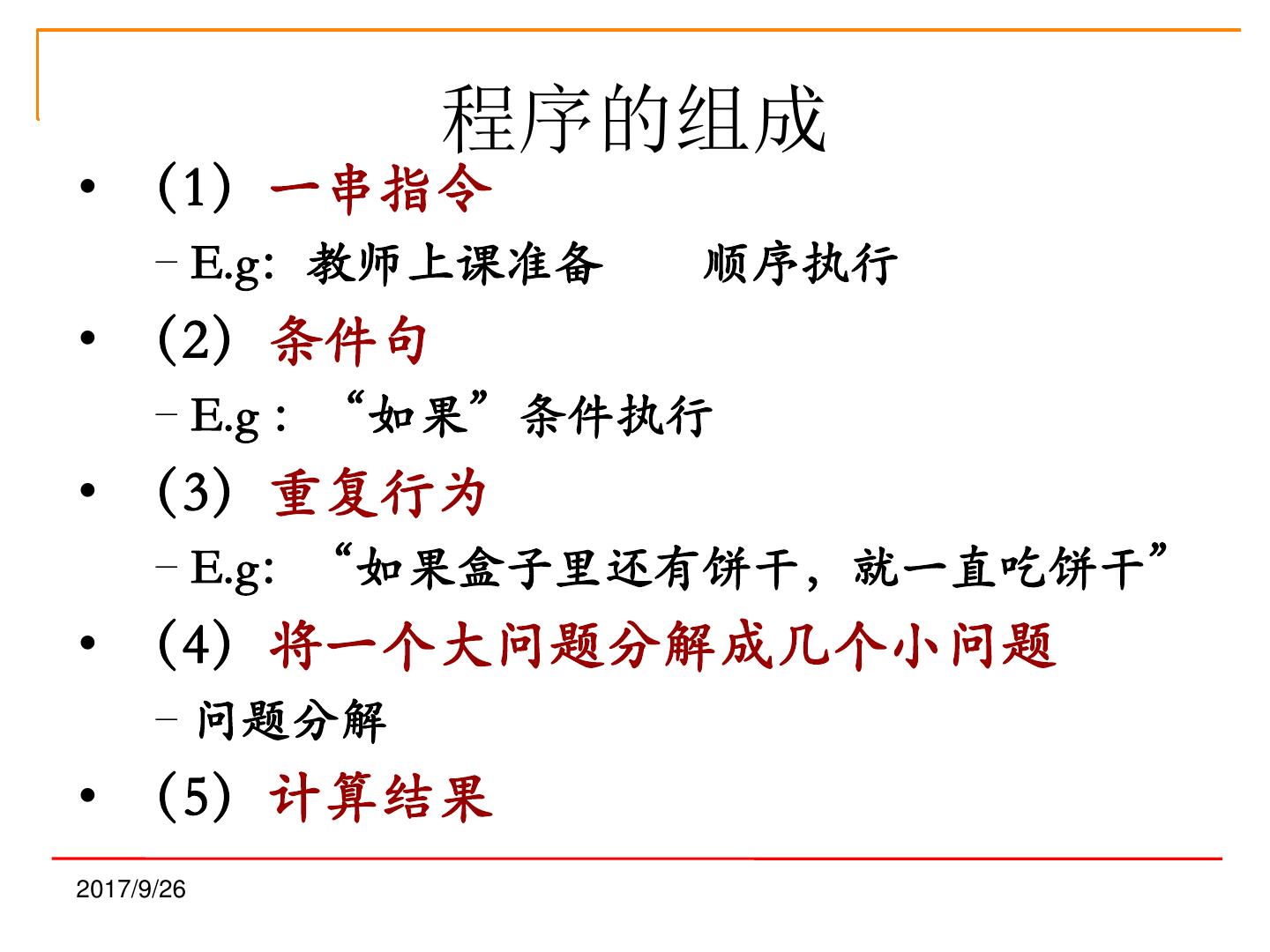 23 . 程序的组成 • (1)一串指令 –E.g:教师上课准备 顺序执行 • (2)条件句 –E.g :“如果”条件执行 • (3)重复行为 –E.g:“如果盒子里还有饼干,就一直吃饼干” • (4)将一个大问题分解成几个小问题 –问题分解 • (5)计算结果 2017/9/26