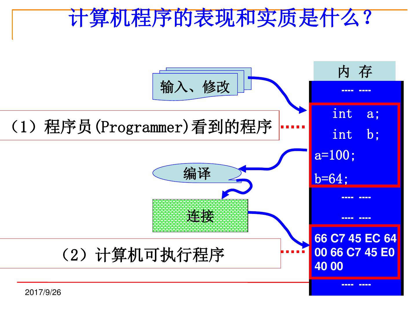 25 . 计算机程序的表现和实质是什么? 内 存 输入、修改 ┉ ┉ int a; (1)程序员(Programmer)看到的程序 int b; a=100; 编译 b=64; ┉ ┉ 连接 ┉ ┉ 66 C7 45 EC 64 (2)计算机可执行程序 00 66 C7 45 E0 40 00 ┉ ┉ 2017/9/26