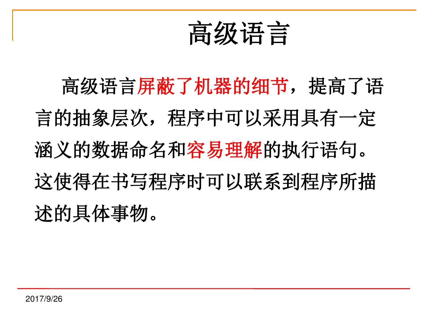 28 . 高级语言 高级语言屏蔽了机器的细节,提高了语 言的抽象层次,程序中可以采用具有一定 涵义的数据命名和容易理解的执行语句。 这使得在书写程序时可以联系到程序所描 述的具体事物。 2017/9/26
