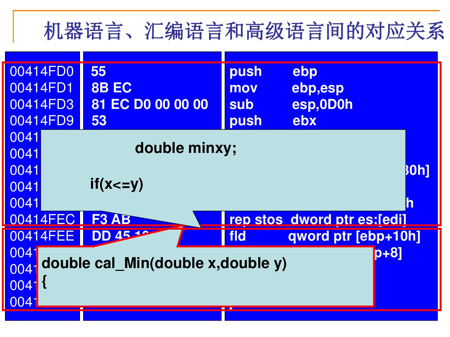 29 . 机器语言、汇编语言和高级语言间的对应关系 00414FD0 55 push ebp 00414FD1 8B EC mov ebp,esp 00414FD3 81 EC D0 00 00 00 sub esp,0D0h 00414FD9 53 push ebx 00414FDA 56 push esi 00414FDB 57 double minxy;push edi 00414FDC 8D BD 30 FF FF FF lea edi,[ebp+FFFFFF30h] 00414FE2 if(x<=y) B9 34 00 00 00 mov ecx,34h 00414FE7 B8 CC CC CC CC mov eax,0CCCCCCCCh 00414FEC F3 AB rep stos dword ptr es:[edi] 00414FEE DD 45 10 fld qword ptr [ebp+10h] 00414FF1 DC 5D 08 fcomp qword ptr [ebp+8] double DF 00414FF4 cal_Min(double E0 x,double fnstsw y)ax { 00414FF6 F6 C4 01 test ah,1 00414FF9 75 08 jne 00415003