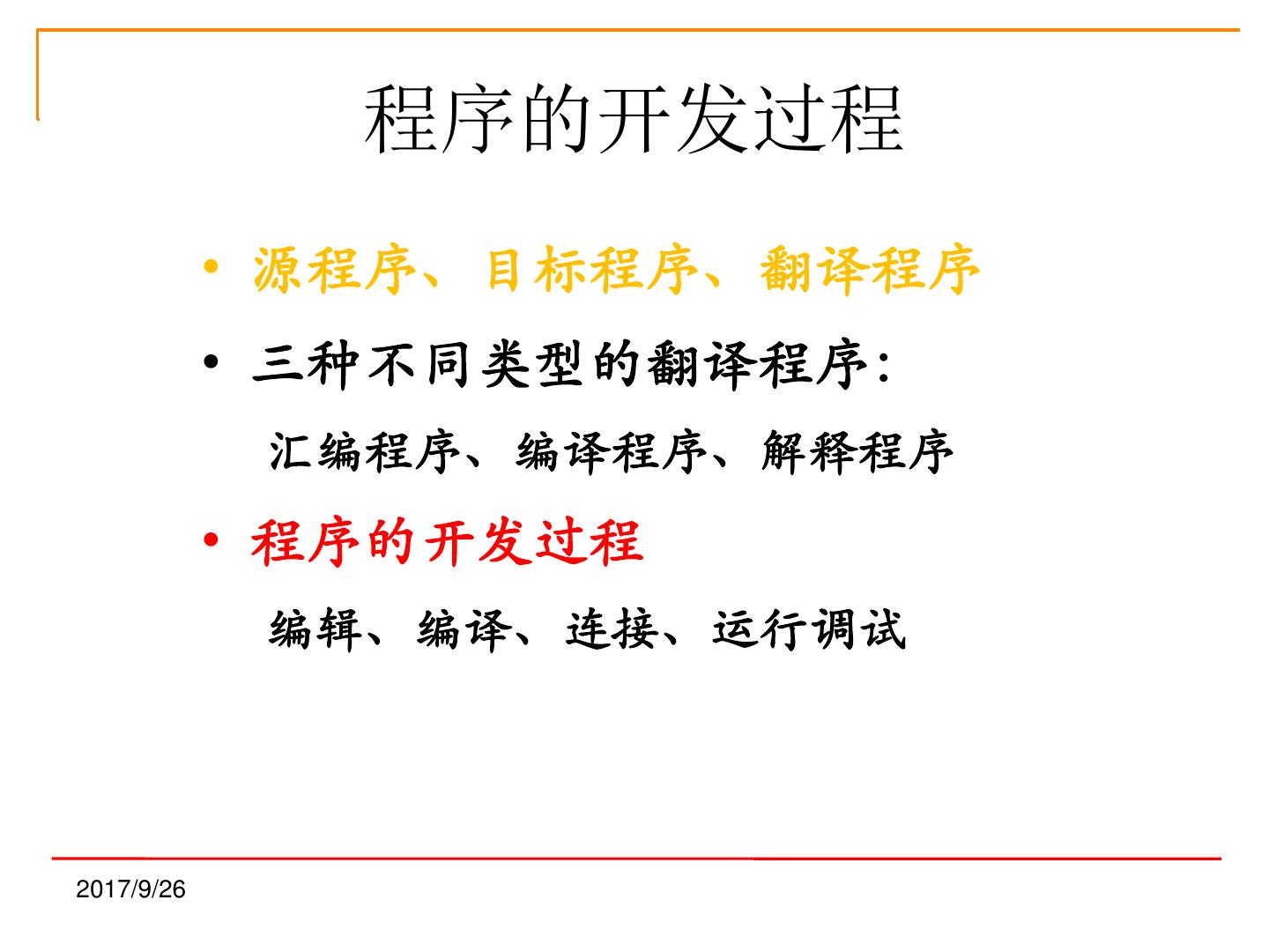 2 . 第一章 绪论 (1)计算机基础知识 (2)软件体系结构入门 (3)计算机编程基础 (4)程序设计语言的发展 (5)面向对象的软件开发过程 (6)程序开发过程及开发工具 2017/9/26