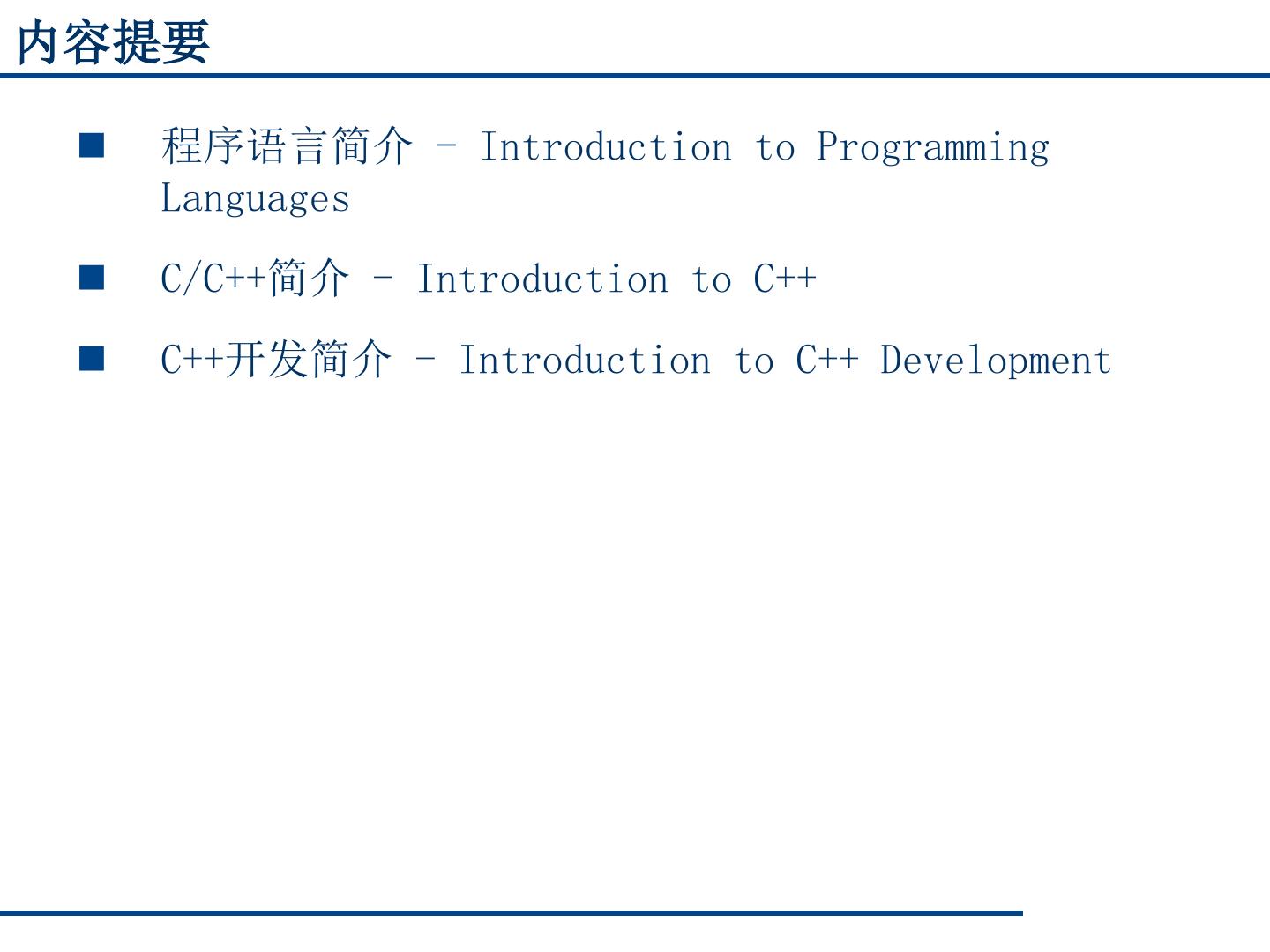 2 .内容提要 程序语言简介 - Introduction to Programming Languages C/C++简介 - Introduction to C++ C++开发简介 - Introduction to C++ Development