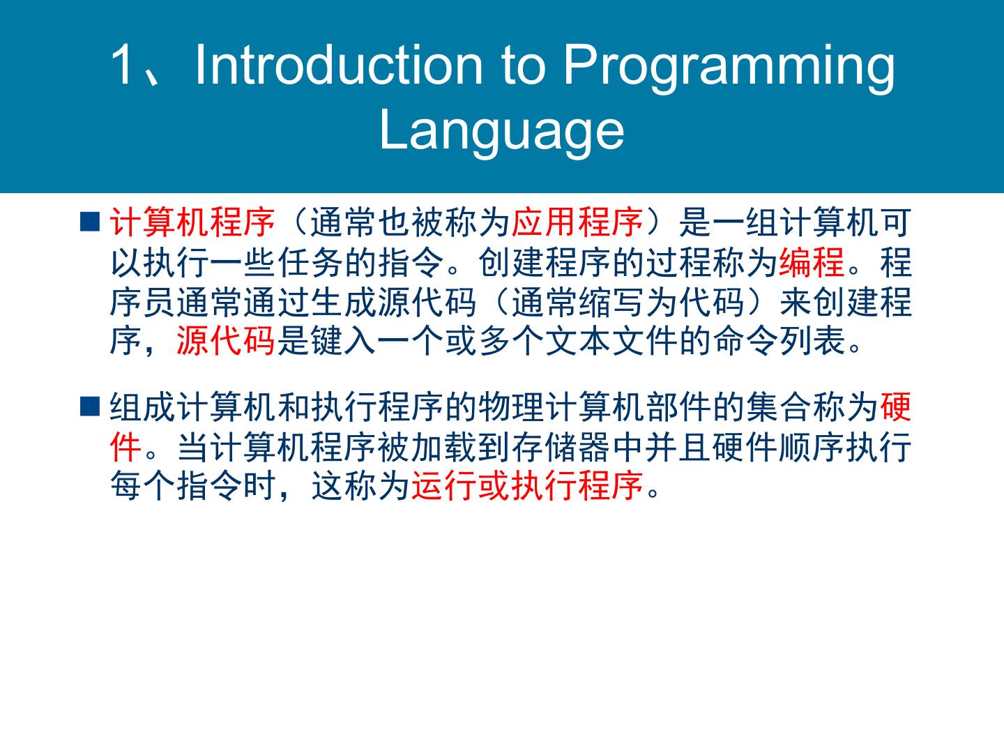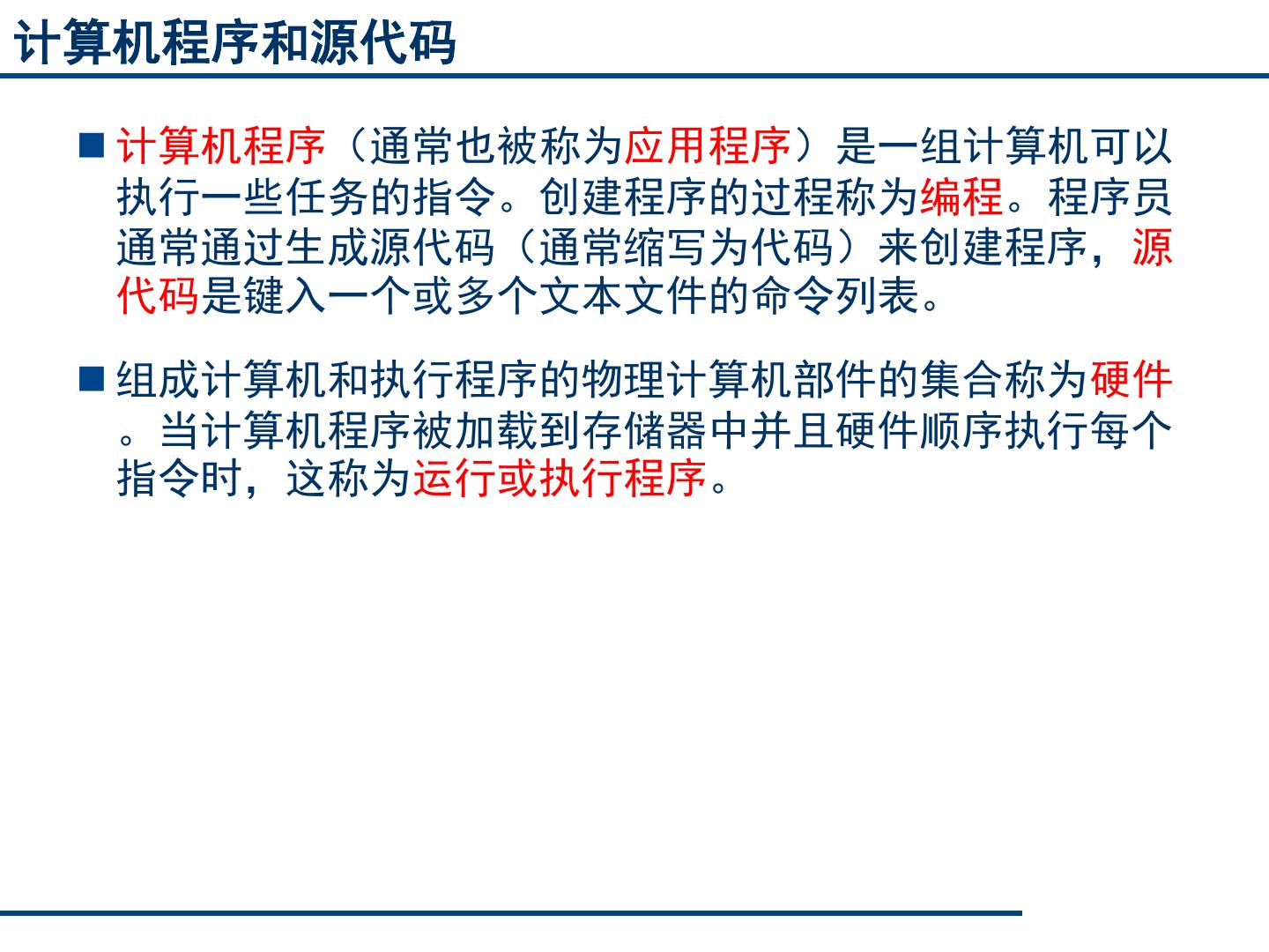 3 .1、Introduction to Programming Language 计算机程序(通常也被称为应用程序)是一组计算机可 以执行一些任务的指令。创建程序的过程称为编程。程 序员通常通过生成源代码(通常缩写为代码)来创建程 序,源代码是键入一个或多个文本文件的命令列表。 组成计算机和执行程序的物理计算机部件的集合称为硬 件。当计算机程序被加载到存储器中并且硬件顺序执行 每个指令时,这称为运行或执行程序。