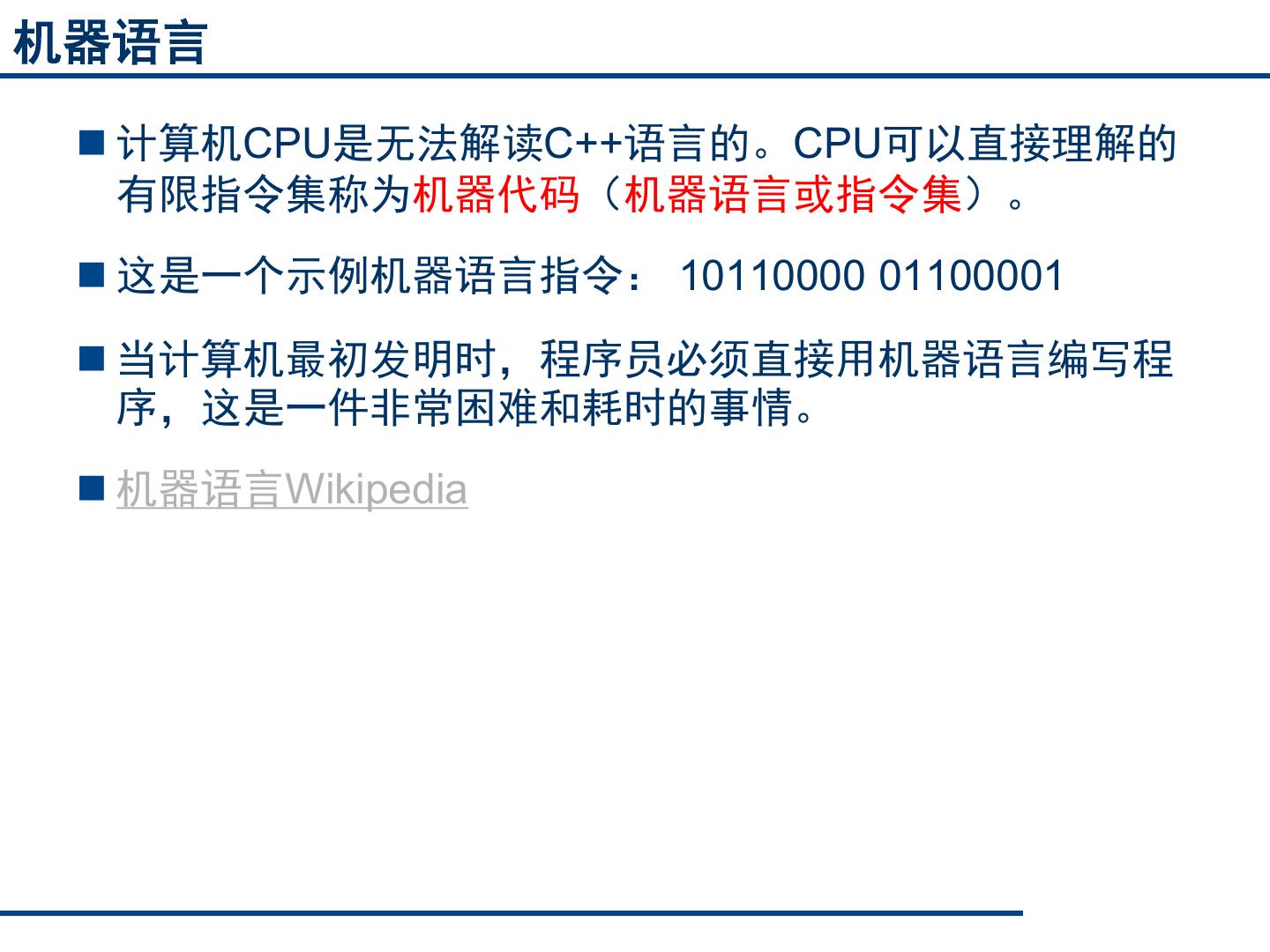 6 .机器语言 计算机CPU是无法解读C++语言的。CPU可以直接理解的 有限指令集称为机器代码(机器语言或指令集)。 这是一个示例机器语言指令: 10110000 01100001 当计算机最初发明时,程序员必须直接用机器语言编写程 序,这是一件非常困难和耗时的事情。 机器语言Wikipedia