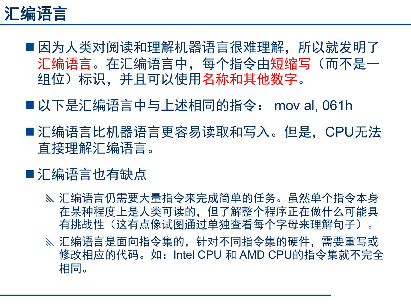 7 .汇编语言 因为人类对阅读和理解机器语言很难理解,所以就发明了 汇编语言。在汇编语言中,每个指令由短缩写(而不是一 组位)标识,并且可以使用名称和其他数字。 以下是汇编语言中与上述相同的指令: mov al, 061h 汇编语言比机器语言更容易读取和写入。但是,CPU无法 直接理解汇编语言。 汇编语言也有缺点 汇编语言仍需要大量指令来完成简单的任务。虽然单个指令本身 在某种程度上是人类可读的,但了解整个程序正在做什么可能具 有挑战性(这有点像试图通过单独查看每个字母来理解句子)。 汇编语言是面向指令集的,针对不同指令集的硬件,需要重写或 修改相应的代码。如:Intel CPU 和 AMD CPU的指令集就不完全 相同。
