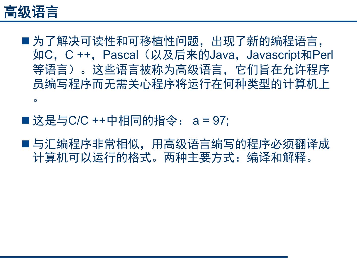 8 .高级语言 为了解决可读性和可移植性问题,出现了新的编程语言, 如C,C ++,Pascal(以及后来的Java,Javascript和Perl 等语言)。这些语言被称为高级语言,它们旨在允许程序 员编写程序而无需关心程序将运行在何种类型的计算机上 。 这是与C/C ++中相同的指令: a = 97; 与汇编程序非常相似,用高级语言编写的程序必须翻译成 计算机可以运行的格式。两种主要方式:编译和解释。