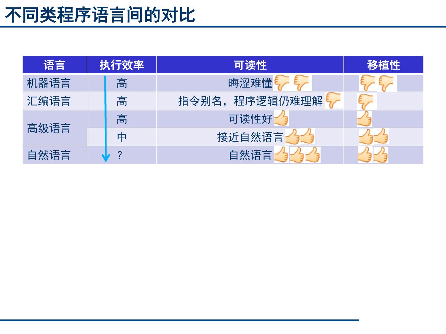 9 .不同类程序语言间的对比 语言 执行效率 可读性 移植性 机器语言 高 晦涩难懂 汇编语言 高 指令别名,程序逻辑仍难理解 高 可读性好 高级语言 中 接近自然语言 自然语言 ? 自然语言