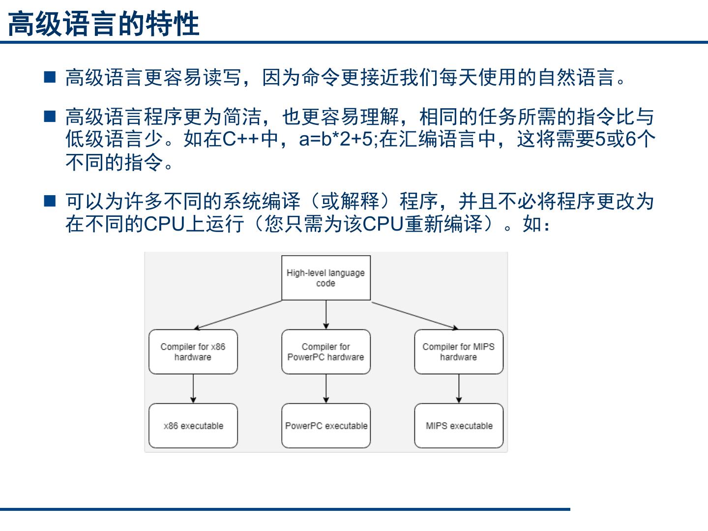 11 .高级语言的特性 高级语言更容易读写,因为命令更接近我们每天使用的自然语言。 高级语言程序更为简洁,也更容易理解,相同的任务所需的指令比与 低级语言少。如在C++中,a=b*2+5;在汇编语言中,这将需要5或6个 不同的指令。 可以为许多不同的系统编译(或解释)程序,并且不必将程序更改为 在不同的CPU上运行(您只需为该CPU重新编译)。如: