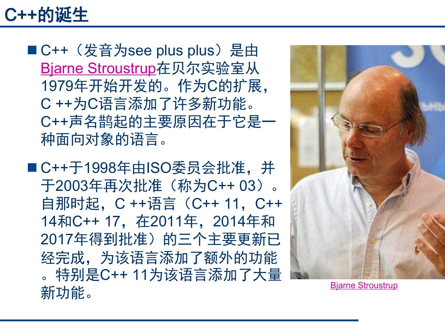 14 .C++的诞生 C++(发音为see plus plus)是由 Bjarne Stroustrup在贝尔实验室从 1979年开始开发的。作为C的扩展, C ++为C语言添加了许多新功能。 C++声名鹊起的主要原因在于它是一 种面向对象的语言。 C++于1998年由ISO委员会批准,并 于2003年再次批准(称为C++ 03)。 自那时起,C ++语言(C++ 11,C++ 14和C++ 17,在2011年,2014年和 2017年得到批准)的三个主要更新已 经完成,为该语言添加了额外的功能 。特别是C++ 11为该语言添加了大量 Bjarne Stroustrup 新功能。