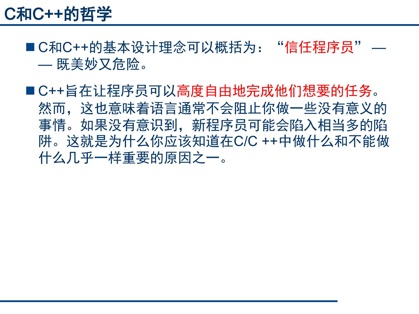 15 .C和C++的哲学 C和C++的基本设计理念可以概括为:“信任程序员” — — 既美妙又危险。 C++旨在让程序员可以高度自由地完成他们想要的任务。 然而,这也意味着语言通常不会阻止你做一些没有意义的 事情。如果没有意识到,新程序员可能会陷入相当多的陷 阱。这就是为什么你应该知道在C/C ++中做什么和不能做 什么几乎一样重要的原因之一。
