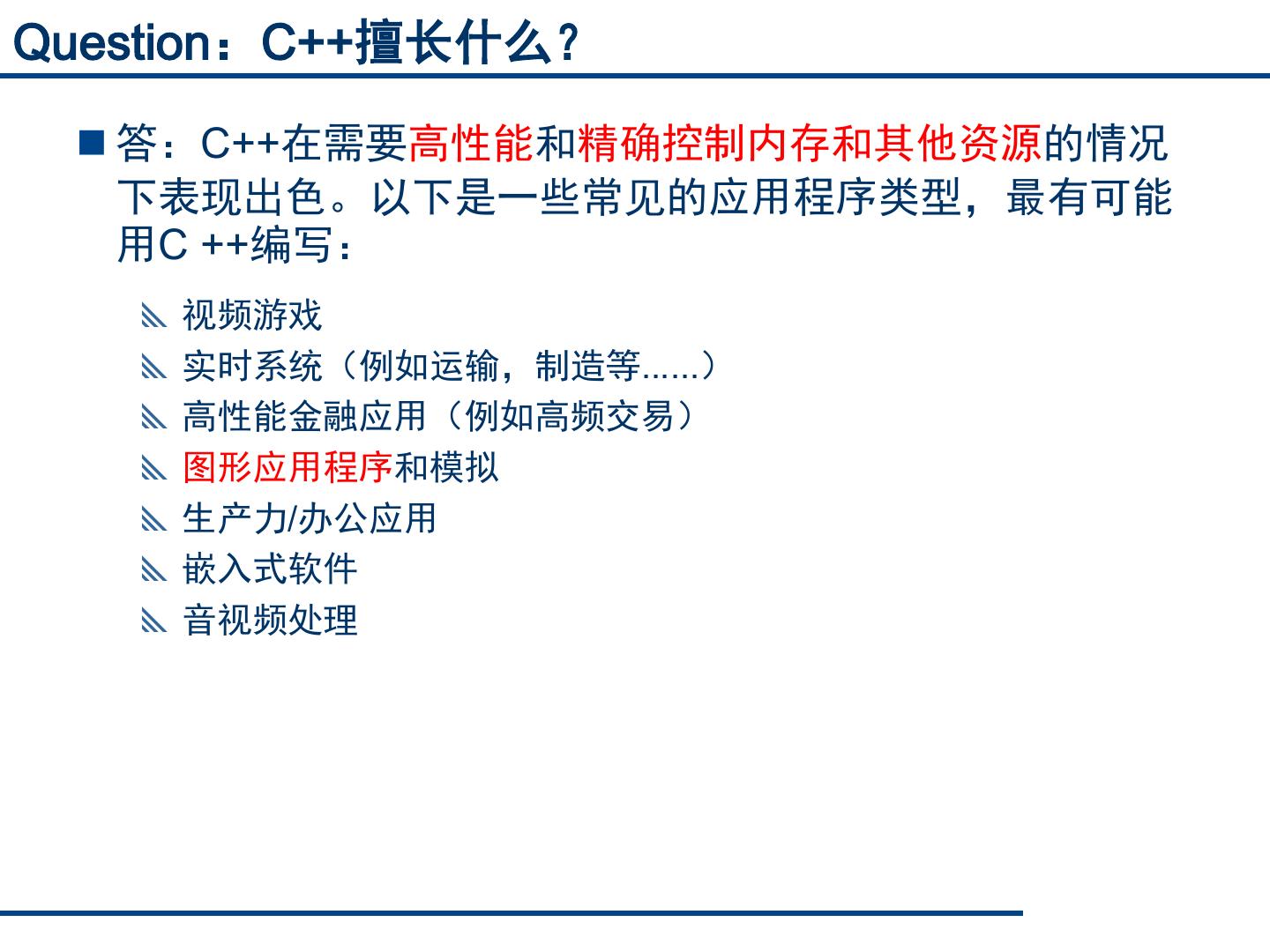 16 .Question:C++擅长什么? 答:C++在需要高性能和精确控制内存和其他资源的情况 下表现出色。以下是一些常见的应用程序类型,最有可能 用C ++编写: 视频游戏 实时系统(例如运输,制造等......) 高性能金融应用(例如高频交易) 图形应用程序和模拟 生产力/办公应用 嵌入式软件 音视频处理